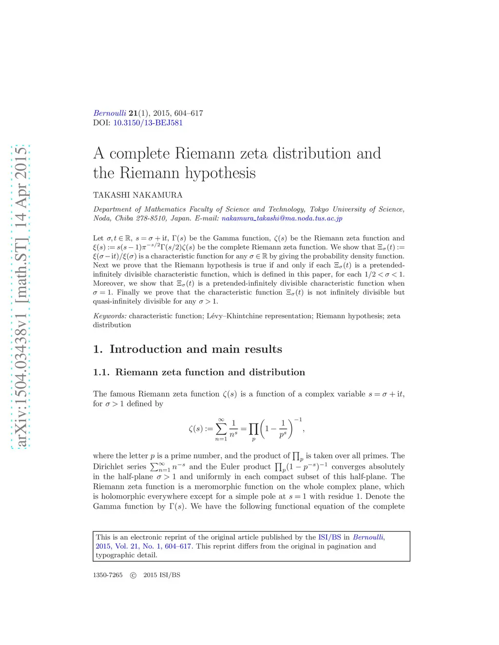 Let , , be the Gamma function, be the Riemann zeta function and be the complete Riemann zeta function. We show that is a characteristic function for any by giving the probability density function. Next we prove that the Riemann hypothesis is true if and only if each is a pretended-infinitely divisible characteristic function, which is defined in this paper, for each . Moreover, we show that is a pretended-infinitely divisible characteristic function when . Finally we prove that the characteristic function is not infinitely divisible but quasi-infinitely divisible for any .