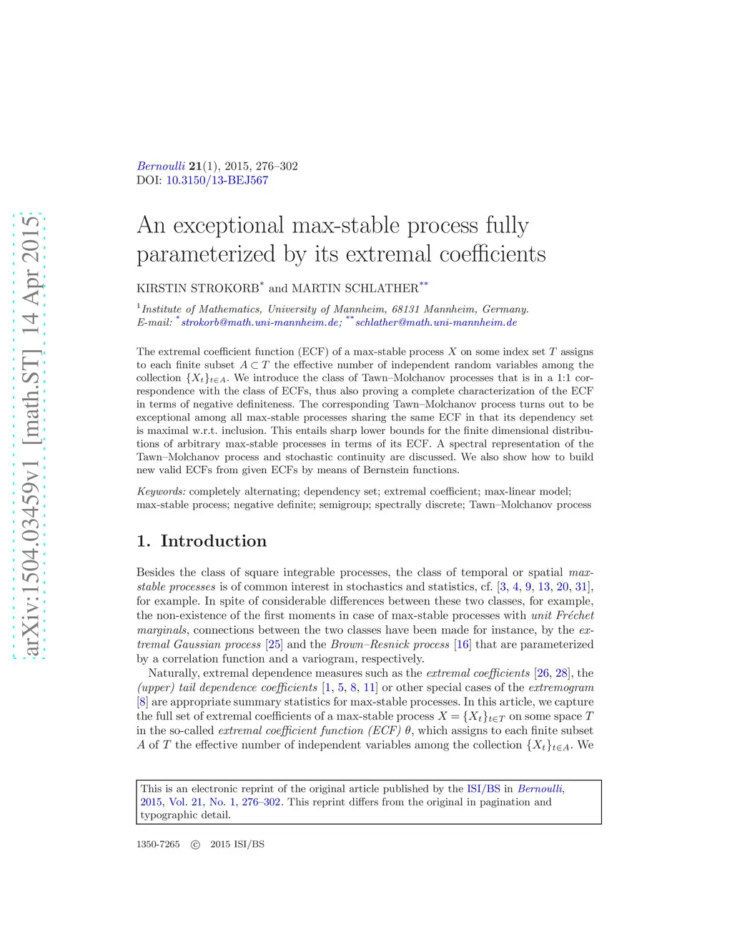 The extremal coefficient function (ECF) of a max-stable process on some index set assigns to each finite subset the effective number of independent random variables among the collection . We introduce the class of Tawn-Molchanov processes that is in a 1:1 correspondence with the class of ECFs, thus also proving a complete characterization of the ECF in terms of negative definiteness. The corresponding Tawn-Molchanov process turns out to be exceptional among all max-stable processes sharing the same ECF in that its dependency set is maximal w.r.t. inclusion. This entails sharp lower bounds for the finite dimensional distributions of arbitrary max-stable processes in terms of its ECF. A spectral representation of the Tawn-Molchanov process and stochastic continuity are discussed. We also show how to build new valid ECFs from given ECFs by means of Bernstein functions.
