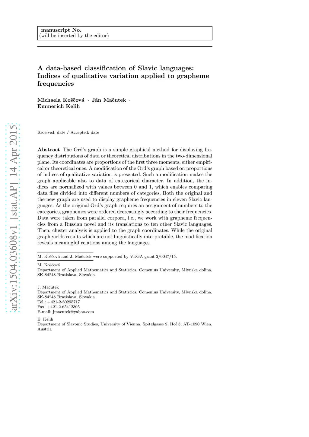The Ord's graph is a simple graphical method for displaying frequency distributions of data or theoretical distributions in the two-dimensional plane. Its coordinates are proportions of the first three moments, either empirical or theoretical ones. A modification of the Ord's graph based on proportions of indices of qualitative variation is presented. Such a modification makes the graph applicable also to data of categorical character. In addition, the indices are normalized with values between 0 and 1, which enables comparing data files divided into different numbers of categories. Both the original and the new graph are used to display grapheme frequencies in eleven Slavic languages. As the original Ord's graph requires an assignment of numbers to the categories, graphemes were ordered decreasingly according to their frequencies. Data were taken from parallel corpora, i.e., we work with grapheme frequencies from a Russian novel and its translations to ten other Slavic languages. Then, cluster analysis is applied to the graph coordinates. While the original graph yields results which are not linguistically interpretable, the modification reveals meaningful relations among the languages.