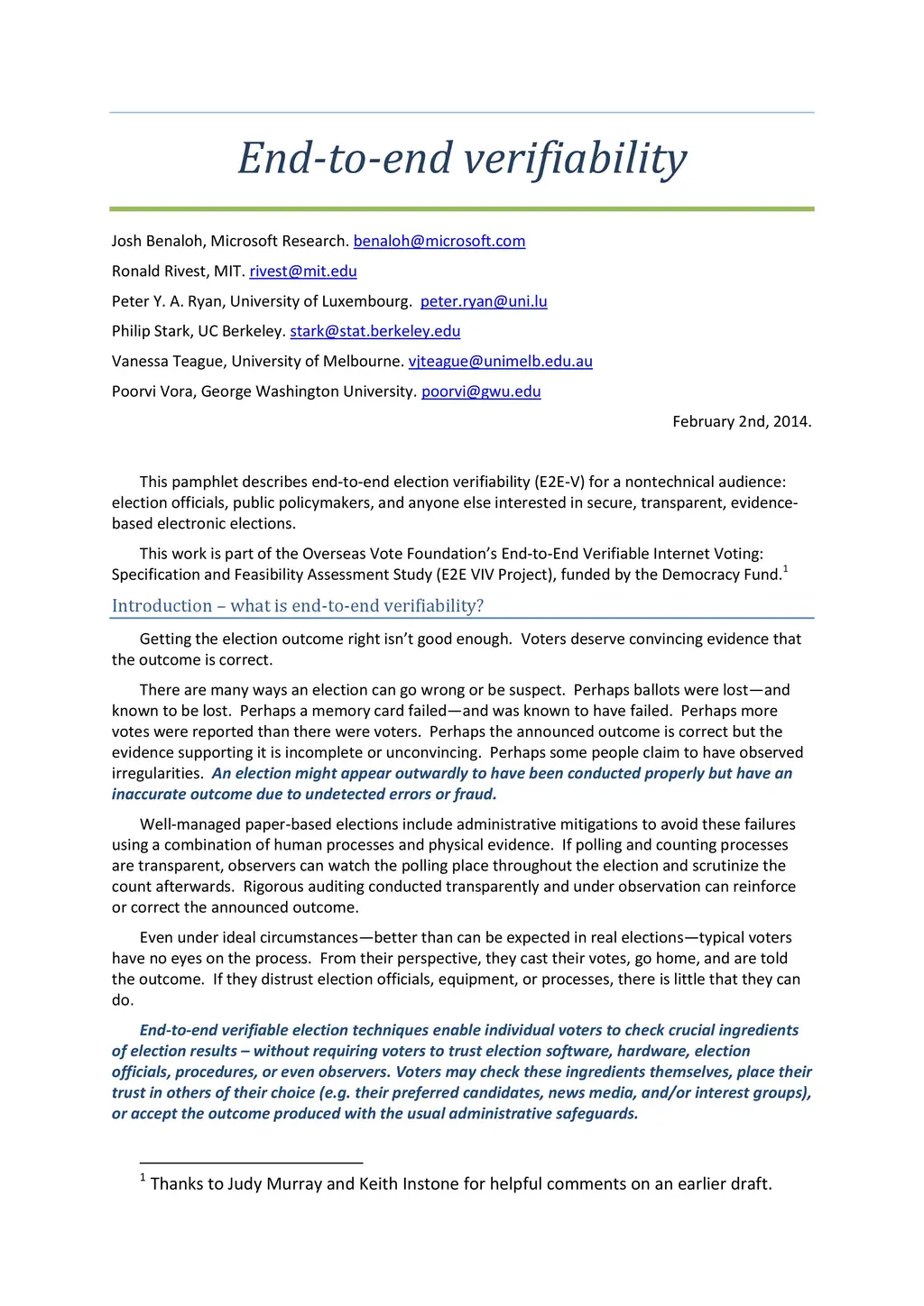 This pamphlet describes end-to-end election verifiability (E2E-V) for a nontechnical audience: election officials, public policymakers, and anyone else interested in secure, transparent, evidence-based electronic elections. This work is part of the Overseas Vote Foundation's End-to-End Verifiable Internet Voting: Specification and Feasibility Assessment Study (E2E VIV Project), funded by the Democracy Fund.