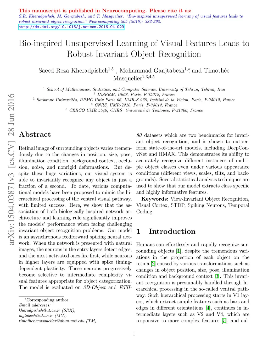 Retinal image of surrounding objects varies tremendously due to the changes in position, size, pose, illumination condition, background context, occlusion, noise, and nonrigid deformations. But despite these huge variations, our visual system is able to invariantly recognize any object in just a fraction of a second. To date, various computational models have been proposed to mimic the hierarchical processing of the ventral visual pathway, with limited success. Here, we show that the association of both biologically inspired network architecture and learning rule significantly improves the models' performance when facing challenging invariant object recognition problems. Our model is an asynchronous feedforward spiking neural network. When the network is presented with natural images, the neurons in the entry layers detect edges, and the most activated ones fire first, while neurons in higher layers are equipped with spike timing-dependent plasticity. These neurons progressively become selective to intermediate complexity visual features appropriate for object categorization. The model is evaluated on 3D-Object and ETH-80 datasets which are two benchmarks for invariant object recognition, and is shown to outperform state-of-the-art models, including DeepConvNet and HMAX. This demonstrates its ability to accurately recognize different instances of multiple object classes even under various appearance conditions (different views, scales, tilts, and backgrounds). Several statistical analysis techniques are used to show that our model extracts class specific and highly informative features.