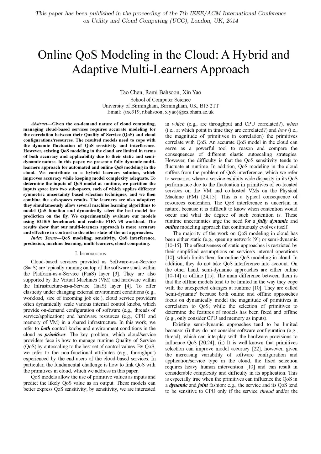Given the on-demand nature of cloud computing, managing cloud-based services requires accurate modeling for the correlation between their Quality of Service (QoS) and cloud configurations/resources. The resulted models need to cope with the dynamic fluctuation of QoS sensitivity and interference. However, existing QoS modeling in the cloud are limited in terms of both accuracy and applicability due to their static and semi- dynamic nature. In this paper, we present a fully dynamic multi- learners approach for automated and online QoS modeling in the cloud. We contribute to a hybrid learners solution, which improves accuracy while keeping model complexity adequate. To determine the inputs of QoS model at runtime, we partition the inputs space into two sub-spaces, each of which applies different symmetric uncertainty based selection techniques, and we then combine the sub-spaces results. The learners are also adaptive; they simultaneously allow several machine learning algorithms to model QoS function and dynamically select the best model for prediction on the fly. We experimentally evaluate our models using RUBiS benchmark and realistic FIFA 98 workload. The results show that our multi-learners approach is more accurate and effective in contrast to the other state-of-the-art approaches.