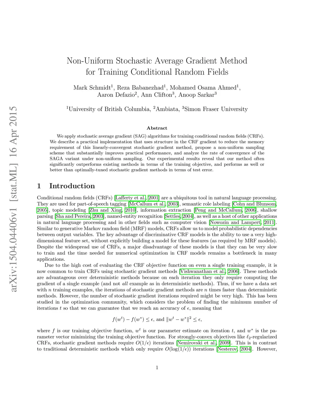 We apply stochastic average gradient (SAG) algorithms for training conditional random fields (CRFs). We describe a practical implementation that uses structure in the CRF gradient to reduce the memory requirement of this linearly-convergent stochastic gradient method, propose a non-uniform sampling scheme that substantially improves practical performance, and analyze the rate of convergence of the SAGA variant under non-uniform sampling. Our experimental results reveal that our method often significantly outperforms existing methods in terms of the training objective, and performs as well or better than optimally-tuned stochastic gradient methods in terms of test error.
