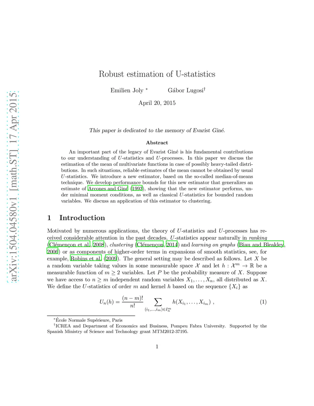 An important part of the legacy of Evarist Gin\é is his fundamental contributions to our understanding of -statistics and -processes. In this paper we discuss the estimation of the mean of multivariate functions in case of possibly heavy-tailed distributions. In such situations, reliable estimates of the mean cannot be obtained by usual -statistics. We introduce a new estimator, based on the so-called median-of-means technique. We develop performance bounds for this new estimator that generalizes an estimate of Arcones and Gin\é (1993), showing that the new estimator performs, under minimal moment conditions, as well as classical -statistics for bounded random variables. We discuss an application of this estimator to clustering.
