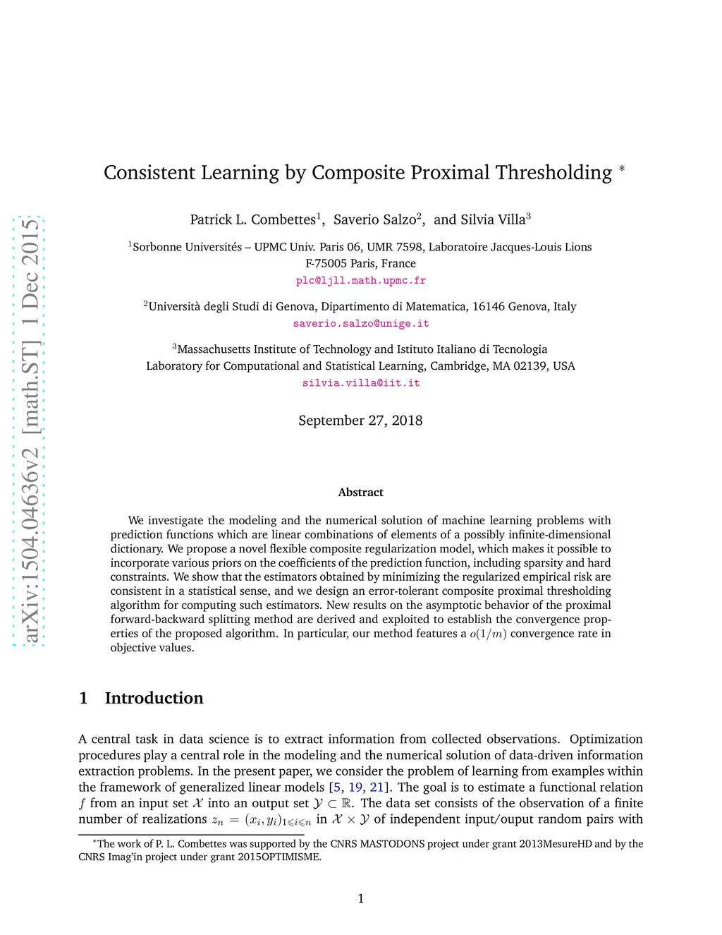 We investigate the modeling and the numerical solution of machine learning problems with prediction functions which are linear combinations of elements of a possibly infinite-dimensional dictionary. We propose a novel flexible composite regularization model, which makes it possible to incorporate various priors on the coefficients of the prediction function, including sparsity and hard constraints. We show that the estimators obtained by minimizing the regularized empirical risk are consistent in a statistical sense, and we design an error-tolerant composite proximal thresholding algorithm for computing such estimators. New results on the asymptotic behavior of the proximal forward-backward splitting method are derived and exploited to establish the convergence properties of the proposed algorithm. In particular, our method features a convergence rate in objective values.