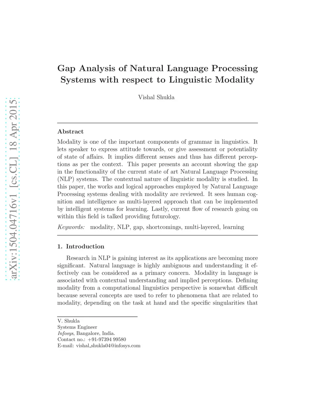 Modality is one of the important components of grammar in linguistics. It lets speaker to express attitude towards, or give assessment or potentiality of state of affairs. It implies different senses and thus has different perceptions as per the context. This paper presents an account showing the gap in the functionality of the current state of art Natural Language Processing (NLP) systems. The contextual nature of linguistic modality is studied. In this paper, the works and logical approaches employed by Natural Language Processing systems dealing with modality are reviewed. It sees human cognition and intelligence as multi-layered approach that can be implemented by intelligent systems for learning. Lastly, current flow of research going on within this field is talked providing futurology.