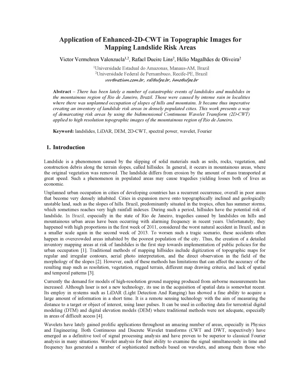 There has been lately a number of catastrophic events of landslides and mudslides in the mountainous region of Rio de Janeiro, Brazil. Those were caused by intense rain in localities where there was unplanned occupation of slopes of hills and mountains. Thus, it became imperative creating an inventory of landslide risk areas in densely populated cities. This work presents a way of demarcating risk areas by using the bidimensional Continuous Wavelet Transform (2D-CWT) applied to high resolution topographic images of the mountainous region of Rio de Janeiro.
