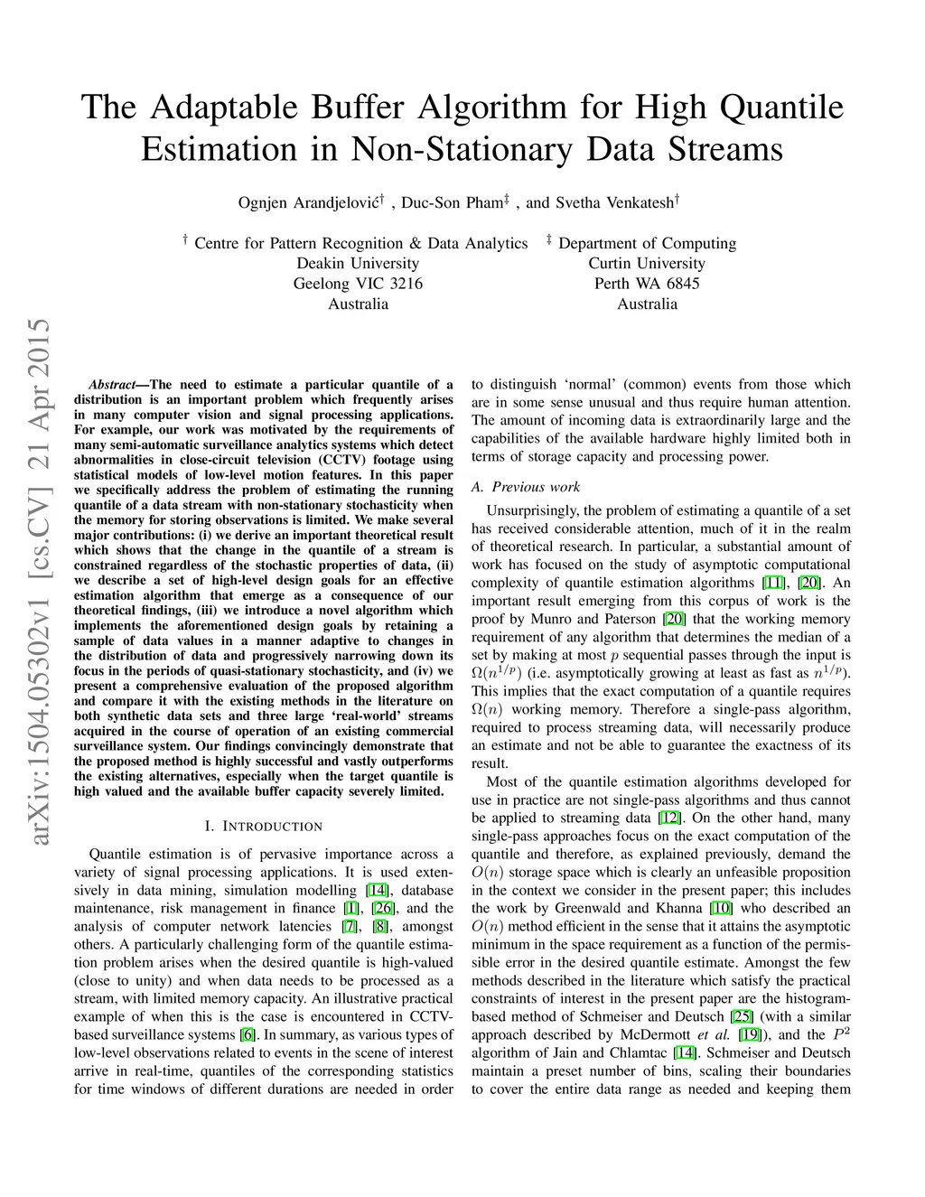 The need to estimate a particular quantile of a distribution is an important problem which frequently arises in many computer vision and signal processing applications. For example, our work was motivated by the requirements of many semi-automatic surveillance analytics systems which detect abnormalities in close-circuit television (CCTV) footage using statistical models of low-level motion features. In this paper we specifically address the problem of estimating the running quantile of a data stream with non-stationary stochasticity when the memory for storing observations is limited. We make several major contributions: (i) we derive an important theoretical result which shows that the change in the quantile of a stream is constrained regardless of the stochastic properties of data, (ii) we describe a set of high-level design goals for an effective estimation algorithm that emerge as a consequence of our theoretical findings, (iii) we introduce a novel algorithm which implements the aforementioned design goals by retaining a sample of data values in a manner adaptive to changes in the distribution of data and progressively narrowing down its focus in the periods of quasi-stationary stochasticity, and (iv) we present a comprehensive evaluation of the proposed algorithm and compare it with the existing methods in the literature on both synthetic data sets and three large `real-world' streams acquired in the course of operation of an existing commercial surveillance system. Our findings convincingly demonstrate that the proposed method is highly successful and vastly outperforms the existing alternatives, especially when the target quantile is high valued and the available buffer capacity severely limited.