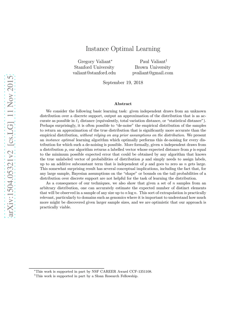 We consider the following basic learning task: given independent draws from an unknown distribution over a discrete support, output an approximation of the distribution that is as accurate as possible in distance (i.e. total variation or statistical distance). Perhaps surprisingly, it is often possible to "de-noise" the empirical distribution of the samples to return an approximation of the true distribution that is significantly more accurate than the empirical distribution, without relying on any prior assumptions on the distribution. We present an instance optimal learning algorithm which optimally performs this de-noising for every distribution for which such a de-noising is possible. More formally, given independent draws from a distribution , our algorithm returns a labelled vector whose expected distance from is equal to the minimum possible expected error that could be obtained by any algorithm that knows the true unlabeled vector of probabilities of distribution and simply needs to assign labels, up to an additive subconstant term that is independent of and goes to zero as gets large. One conceptual implication of this result is that for large samples, Bayesian assumptions on the "shape" or bounds on the tail probabilities of a distribution over discrete support are not helpful for the task of learning the distribution. As a consequence of our techniques, we also show that given a set of samples from an arbitrary distribution, one can accurately estimate the expected number of distinct elements that will be observed in a sample of any size up to . This sort of extrapolation is practically relevant, particularly to domains such as genomics where it is important to understand how much more might be discovered given larger sample sizes, and we are optimistic that our approach is practically viable.