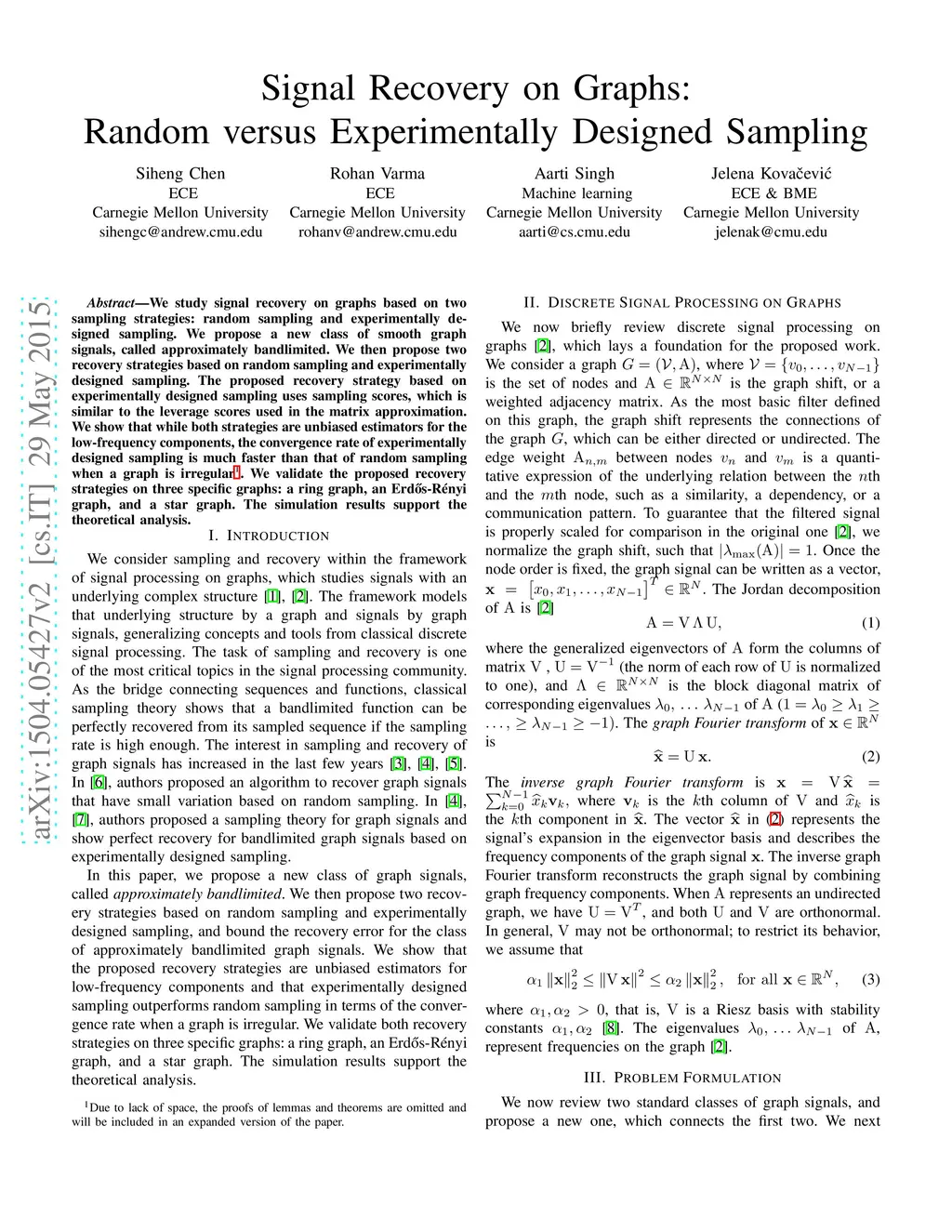 We study signal recovery on graphs based on two sampling strategies: random sampling and experimentally designed sampling. We propose a new class of smooth graph signals, called approximately bandlimited, which generalizes the bandlimited class and is similar to the globally smooth class. We then propose two recovery strategies based on random sampling and experimentally designed sampling. The proposed recovery strategy based on experimentally designed sampling is similar to the leverage scores used in the matrix approximation. We show that while both strategies are unbiased estimators for the low-frequency components, the convergence rate of experimentally designed sampling is much faster than that of random sampling when a graph is irregular. We validate the proposed recovery strategies on three specific graphs: a ring graph, an Erd\H{o}s-R\'enyi graph, and a star graph. The simulation results support the theoretical analysis.