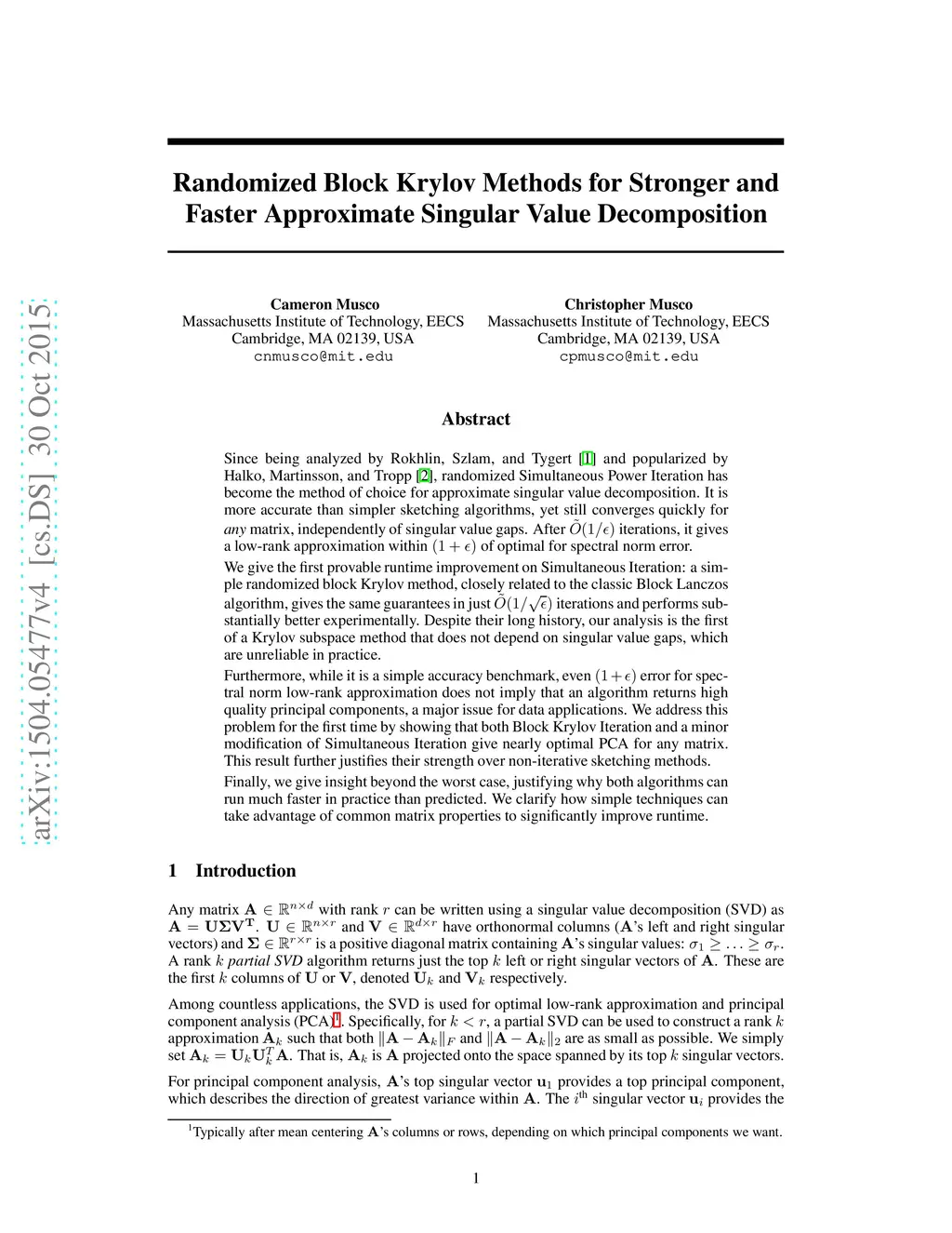 Since being analyzed by Rokhlin, Szlam, and Tygert and popularized by Halko, Martinsson, and Tropp, randomized Simultaneous Power Iteration has become the method of choice for approximate singular value decomposition. It is more accurate than simpler sketching algorithms, yet still converges quickly for any matrix, independently of singular value gaps. After iterations, it gives a low-rank approximation within of optimal for spectral norm error. We give the first provable runtime improvement on Simultaneous Iteration -- a simple randomized variant of the classic Block Lanczos method gives the same guarantees in just iterations and performs substantially better experimentally. Despite their long history, our analysis is the first of a Krylov subspace method like Block Lanczos that does not depend on singular value gaps, which are unreliable in practice. Furthermore, while it is a simple accuracy benchmark, even error for spectral norm low rank approximation does not imply that an algorithm returns high quality principal components, a major issue for data applications. We address this problem for the first time by showing that both Block Lanczos and a minor modification of Simultaneous Iteration give nearly optimal PCA for any matrix. This result further justifies their strength over non-iterative sketching methods.