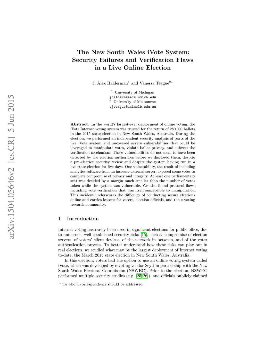 In the world's largest-ever deployment of online voting, the iVote Internet voting system was trusted for the return of 280,000 ballots in the 2015 state election in New South Wales, Australia. During the election, we performed an independent security analysis of parts of the live iVote system and uncovered severe vulnerabilities that could be leveraged to manipulate votes, violate ballot privacy, and subvert the verification mechanism. These vulnerabilities do not seem to have been detected by the election authorities before we disclosed them, despite a pre-election security review and despite the system having run in a live state election for five days. One vulnerability, the result of including analytics software from an insecure external server, exposed some votes to complete compromise of privacy and integrity. At least one parliamentary seat was decided by a margin much smaller than the number of votes taken while the system was vulnerable. We also found protocol flaws, including vote verification that was itself susceptible to manipulation. This incident underscores the difficulty of conducting secure elections online and carries lessons for voters, election officials, and the e-voting research community.