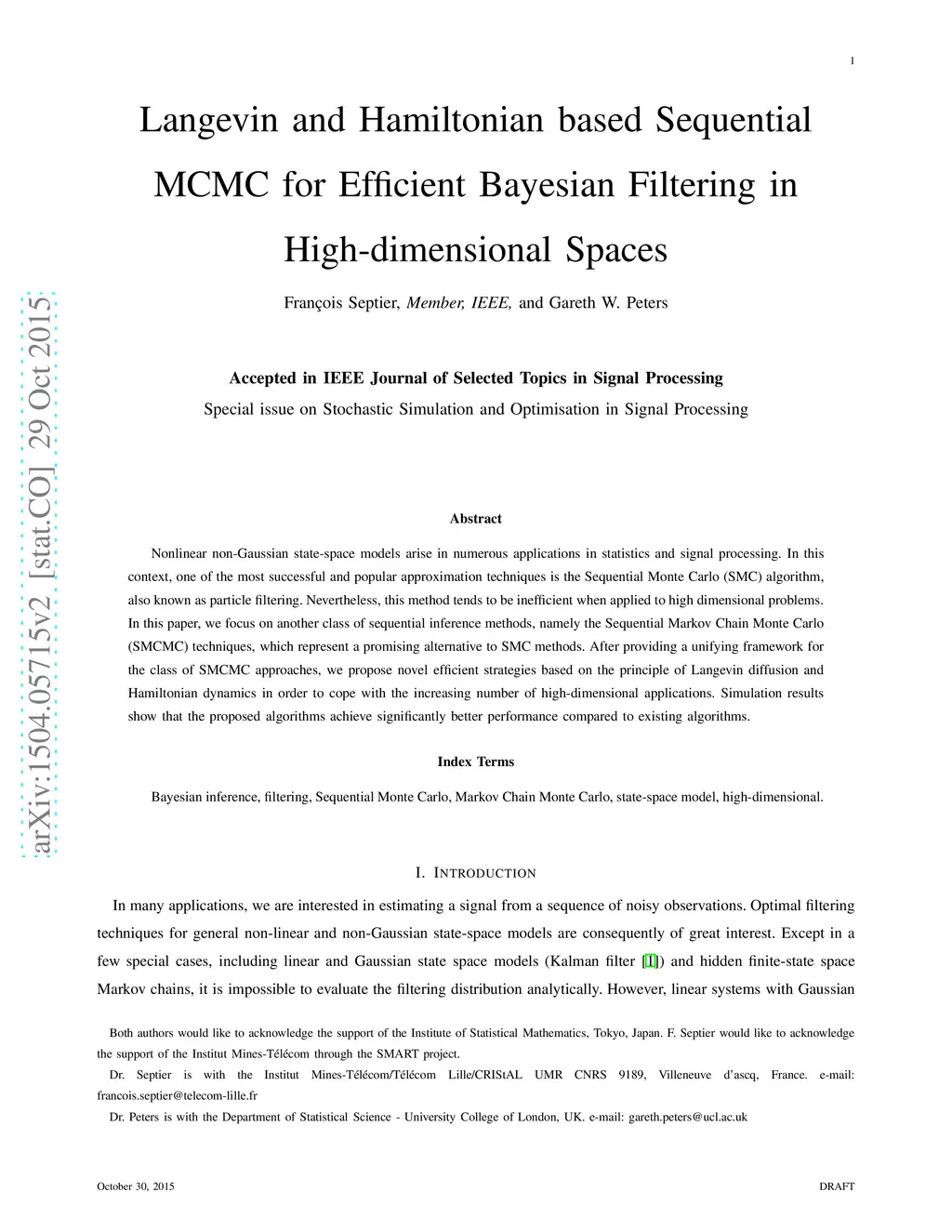 Nonlinear non-Gaussian state-space models arise in numerous applications in statistics and signal processing. In this context, one of the most successful and popular approximation techniques is the Sequential Monte Carlo (SMC) algorithm, also known as particle filtering. Nevertheless, this method tends to be inefficient when applied to high dimensional problems. In this paper, we focus on another class of sequential inference methods, namely the Sequential Markov Chain Monte Carlo (SMCMC) techniques, which represent a promising alternative to SMC methods. After providing a unifying framework for the class of SMCMC approaches, we propose novel efficient strategies based on the principle of Langevin diffusion and Hamiltonian dynamics in order to cope with the increasing number of high-dimensional applications. Simulation results show that the proposed algorithms achieve significantly better performance compared to existing algorithms.