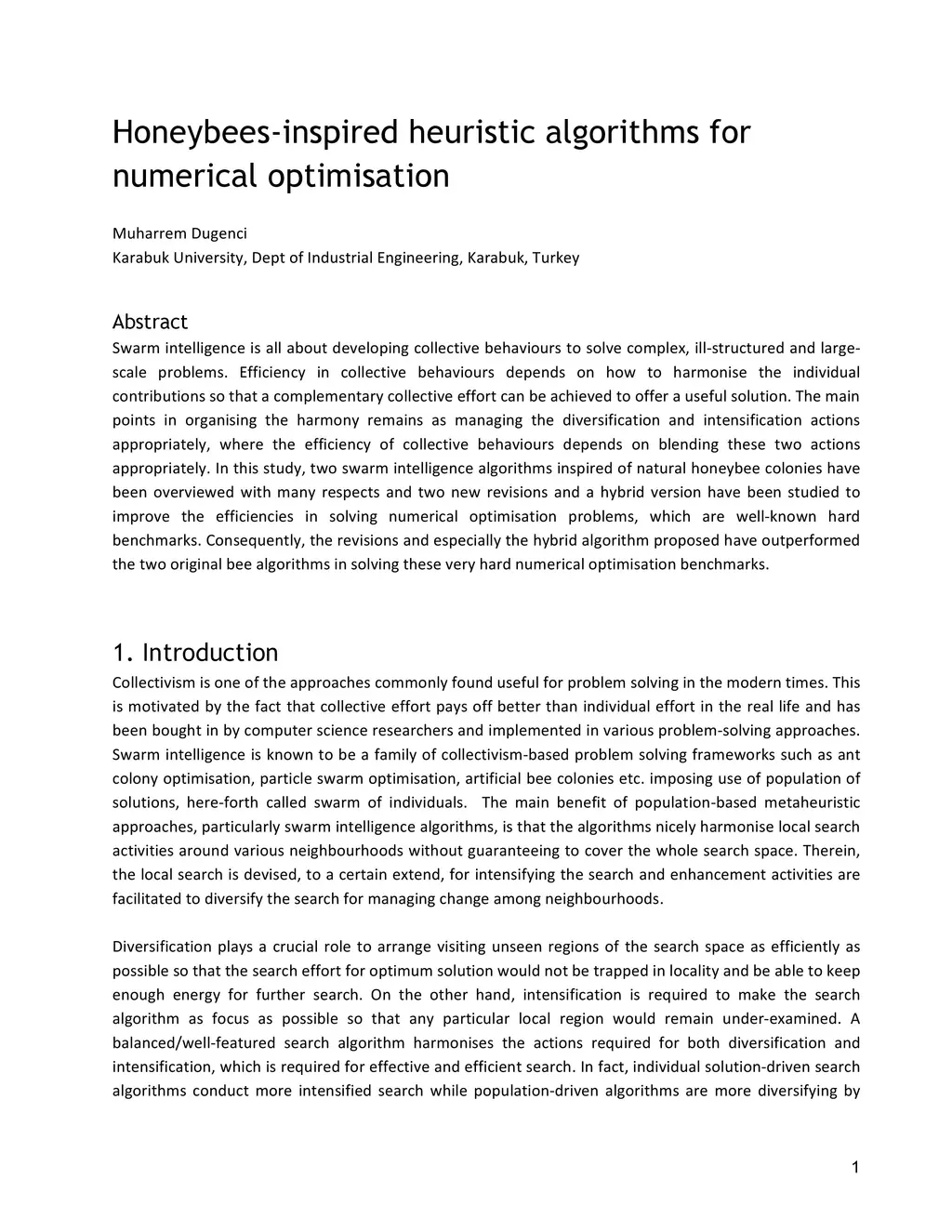 Swarm intelligence is all about developing collective behaviours to solve complex, ill-structured and large-scale problems. Efficiency in collective behaviours depends on how to harmonise the individual contributions so that a complementary collective effort can be achieved to offer a useful solution. The main points in organising the harmony remains as managing the diversification and intensification actions appropriately, where the efficiency of collective behaviours depends on blending these two actions appropriately. In this study, two swarm intelligence algorithms inspired of natural honeybee colonies have been overviewed with many respects and two new revisions and a hybrid version have been studied to improve the efficiencies in solving numerical optimisation problems, which are well-known hard benchmarks. Consequently, the revisions and especially the hybrid algorithm proposed have outperformed the two original bee algorithms in solving these very hard numerical optimisation benchmarks.