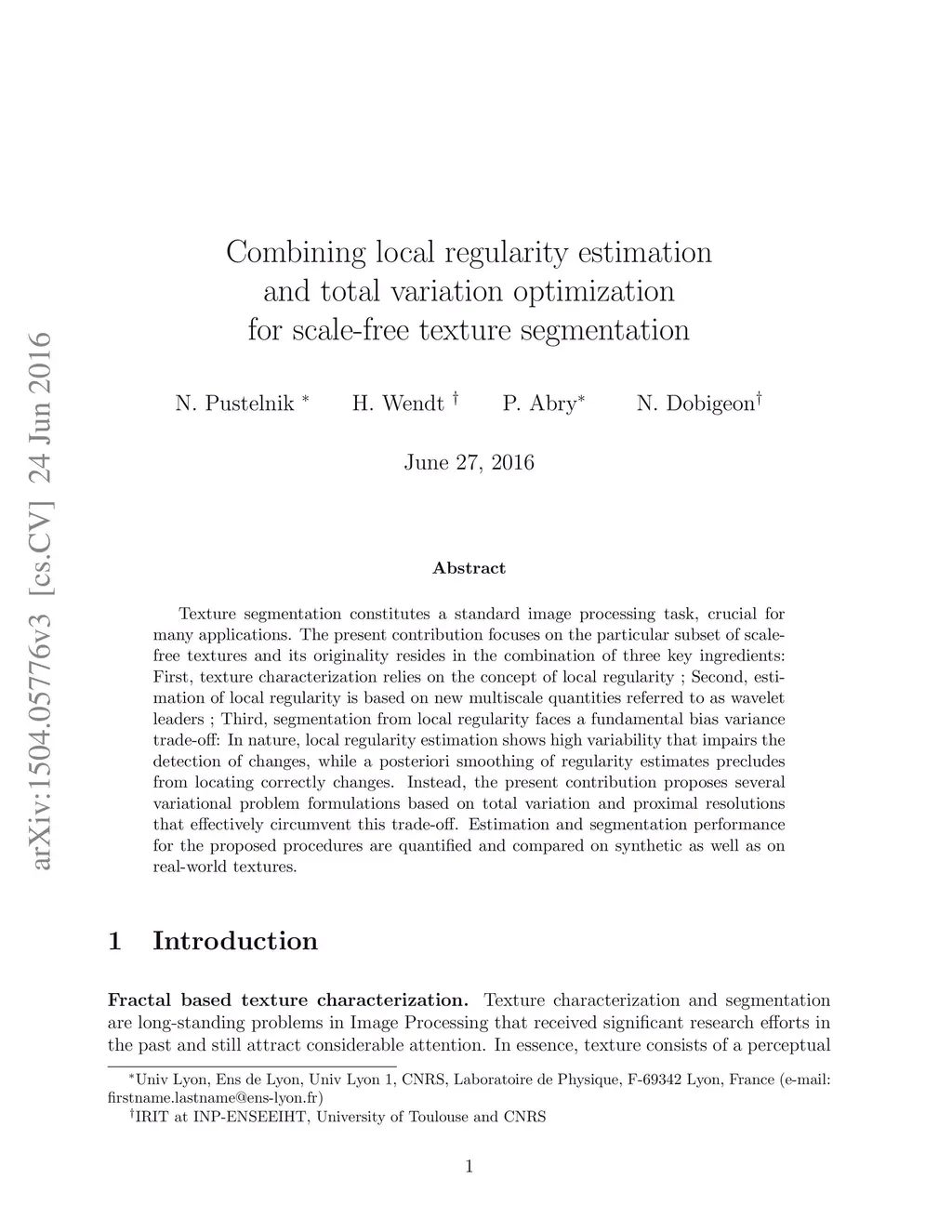 Texture segmentation constitutes a standard image processing task, crucial to many applications. The present contribution focuses on the particular subset of scale-free textures and its originality resides in the combination of three key ingredients: First, texture characterization relies on the concept of local regularity ; Second, estimation of local regularity is based on new multiscale quantities referred to as wavelet leaders ; Third, segmentation from local regularity faces a fundamental bias variance trade-off: In nature, local regularity estimation shows high variability that impairs the detection of changes, while a posteriori smoothing of regularity estimates precludes from locating correctly changes. Instead, the present contribution proposes several variational problem formulations based on total variation and proximal resolutions that effectively circumvent this trade-off. Estimation and segmentation performance for the proposed procedures are quantified and compared on synthetic as well as on real-world textures.