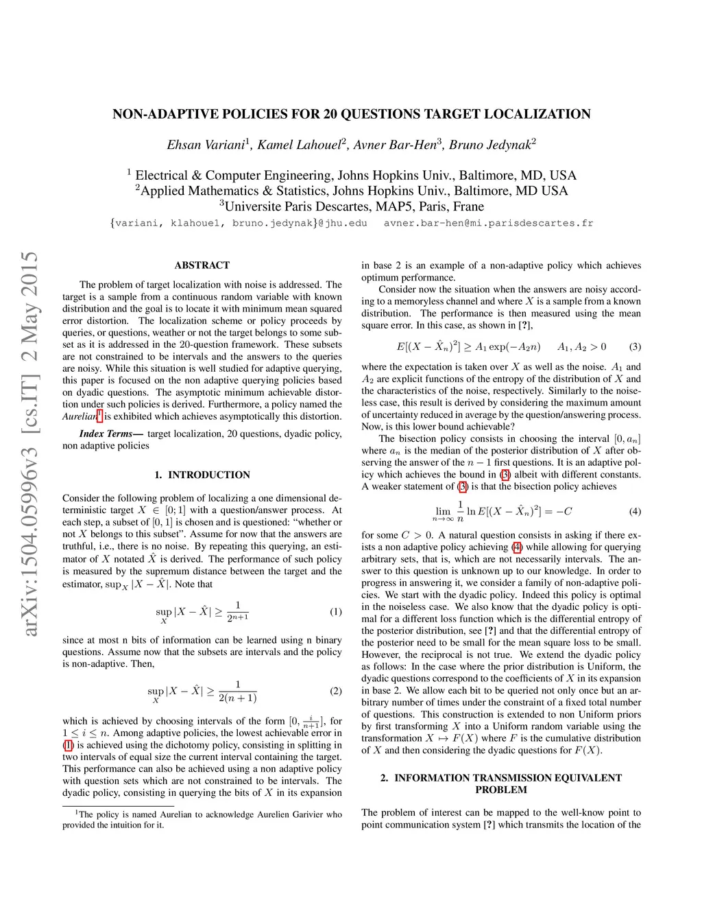 The problem of target localization with noise is addressed. The target is a sample from a continuous random variable with known distribution and the goal is to locate it with minimum mean squared error distortion. The localization scheme or policy proceeds by queries, or questions, weather or not the target belongs to some subset as it is addressed in the 20-question framework. These subsets are not constrained to be intervals and the answers to the queries are noisy. While this situation is well studied for adaptive querying, this paper is focused on the non adaptive querying policies based on dyadic questions. The asymptotic minimum achievable distortion under such policies is derived. Furthermore, a policy named the Aurelian1 is exhibited which achieves asymptotically this distortion.
