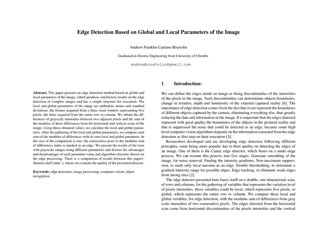 This paper presents an edge detection method based on global and local parameters of the image, which produces satisfactory results on the edge detection of complex images and has a simple structure for execution. The local and global parameters of the image are arithmetic means and standard deviations, the former acquired from a three sized window representing five pixels, the latter acquired from the entire row or column. We obtain the differences of grayscale intensities between two adjacent pixels and the sum of the modulus of these differences from the horizontal and vertical scans of the image. Using these obtained values, we calculate the local and global parameters. After the gathering of the local and global parameters, we compare each sum of the modulus of differences with its own local and global parameter. In the case of the comparison is true, the consecutive pixel to the modulus sum of differences index is marked as an edge. We present the results of the tests with grayscale images using different parameters and discuss the advantages and disadvantages of each parameter value and algorithm structure chosen on the edge processing. There is a comparison of results between this papers detector and Canny, where we evaluate the quality of the presented detector.