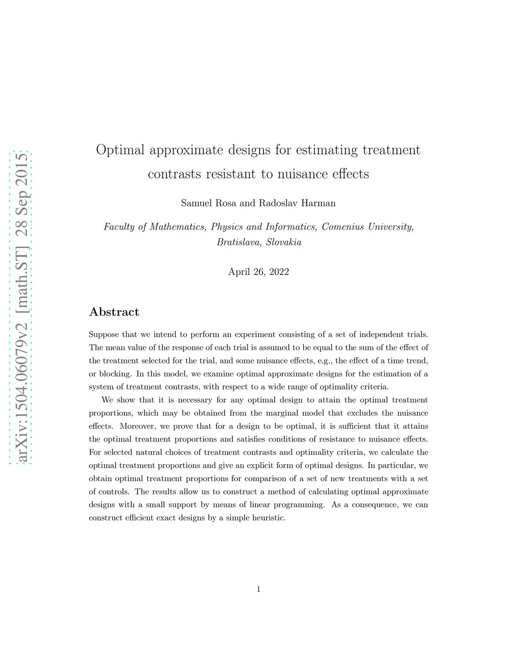Suppose that we intend to perform an experiment consisting of a set of independent trials. The mean value of the response of each trial is assumed to be equal to the sum of the effect of the treatment selected for the trial, and some nuisance effects, e.g., the effect of a time trend, or blocking. In this model, we examine optimal approximate designs for the estimation of a system of treatment contrasts, with respect to a wide range of optimality criteria. We show that it is necessary for any optimal design to attain the optimal treatment proportions, which may be obtained from the marginal model that excludes the nuisance effects. Moreover, we prove that for a design to be optimal, it is sufficient that it attains the optimal treatment proportions and satisfies conditions of resistance to nuisance effects. For selected natural choices of treatment contrasts and optimality criteria, we calculate the optimal treatment proportions and give an explicit form of optimal designs. In particular, we obtain optimal treatment proportions for comparison of a set of new treatments with a set of controls. The results allow us to construct a method of calculating optimal approximate designs with a small support by means of linear programming. As a consequence, we can construct efficient exact designs by a simple heuristic.
