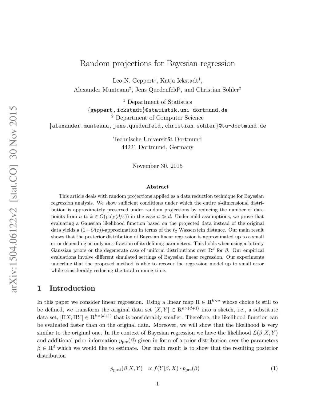 This article deals with random projections applied as a data reduction technique for Bayesian regression analysis. We show sufficient conditions under which the entire -dimensional distribution is approximately preserved under random projections by reducing the number of data points from to in the case . Under mild assumptions, we prove that evaluating a Gaussian likelihood function based on the projected data instead of the original data yields a -approximation in terms of the Wasserstein distance. Our main result shows that the posterior distribution of Bayesian linear regression is approximated up to a small error depending on only an -fraction of its defining parameters. This holds when using arbitrary Gaussian priors or the degenerate case of uniform distributions over for . Our empirical evaluations involve different simulated settings of Bayesian linear regression. Our experiments underline that the proposed method is able to recover the regression model up to small error while considerably reducing the total running time.