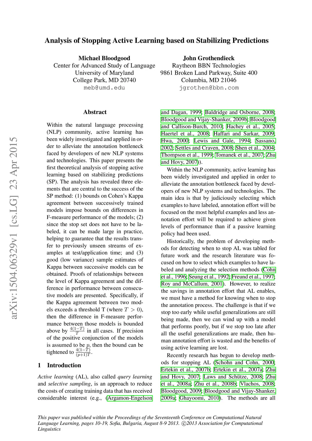Within the natural language processing (NLP) community, active learning has been widely investigated and applied in order to alleviate the annotation bottleneck faced by developers of new NLP systems and technologies. This paper presents the first theoretical analysis of stopping active learning based on stabilizing predictions (SP). The analysis has revealed three elements that are central to the success of the SP method: (1) bounds on Cohen's Kappa agreement between successively trained models impose bounds on differences in F-measure performance of the models; (2) since the stop set does not have to be labeled, it can be made large in practice, helping to guarantee that the results transfer to previously unseen streams of examples at test/application time; and (3) good (low variance) sample estimates of Kappa between successive models can be obtained. Proofs of relationships between the level of Kappa agreement and the difference in performance between consecutive models are presented. Specifically, if the Kappa agreement between two models exceeds a threshold T (where ), then the difference in F-measure performance between those models is bounded above by in all cases. If precision of the positive conjunction of the models is assumed to be , then the bound can be tightened to .