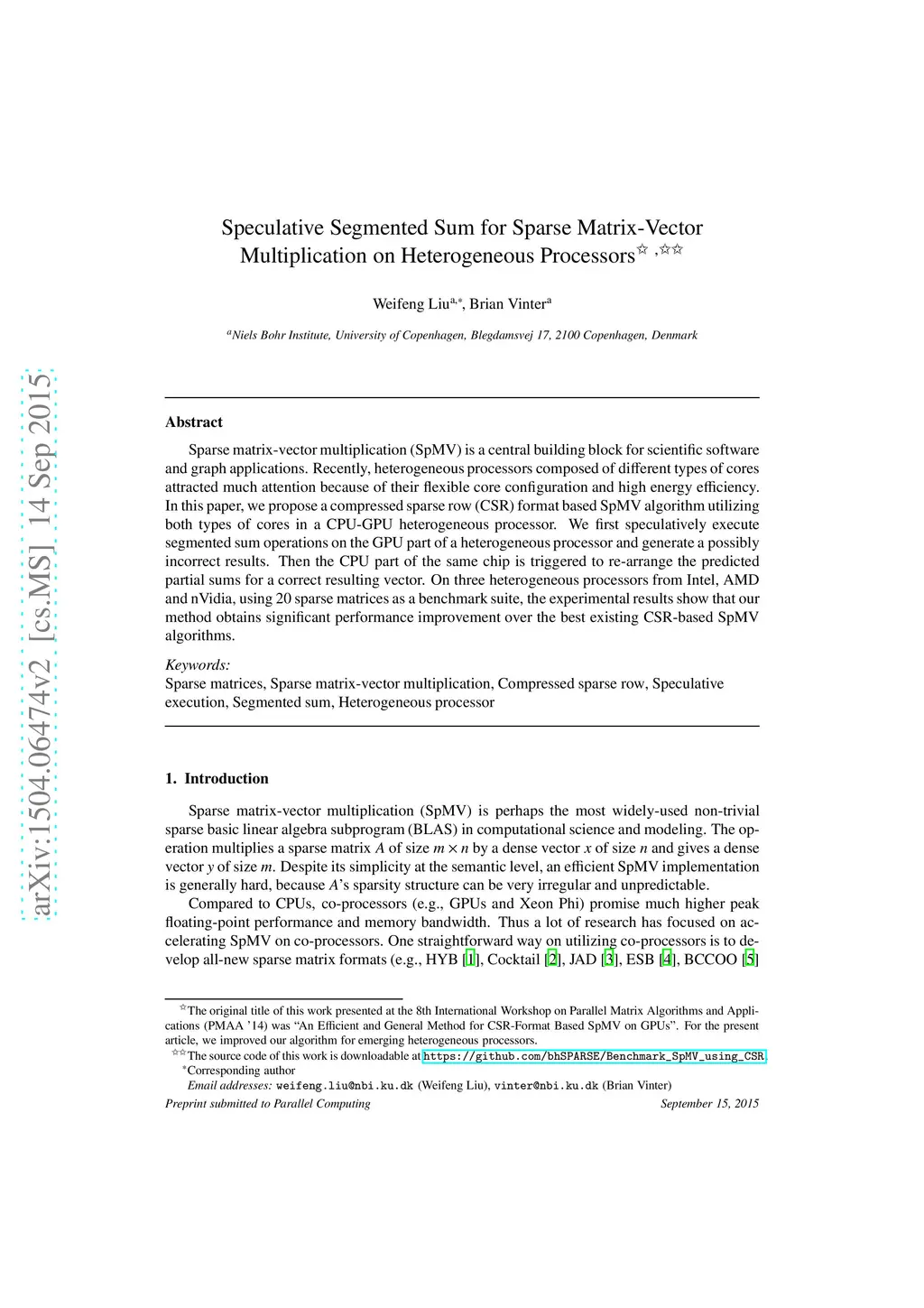 Speculative Segmented Sum for Sparse Matrix-Vector Multiplication on