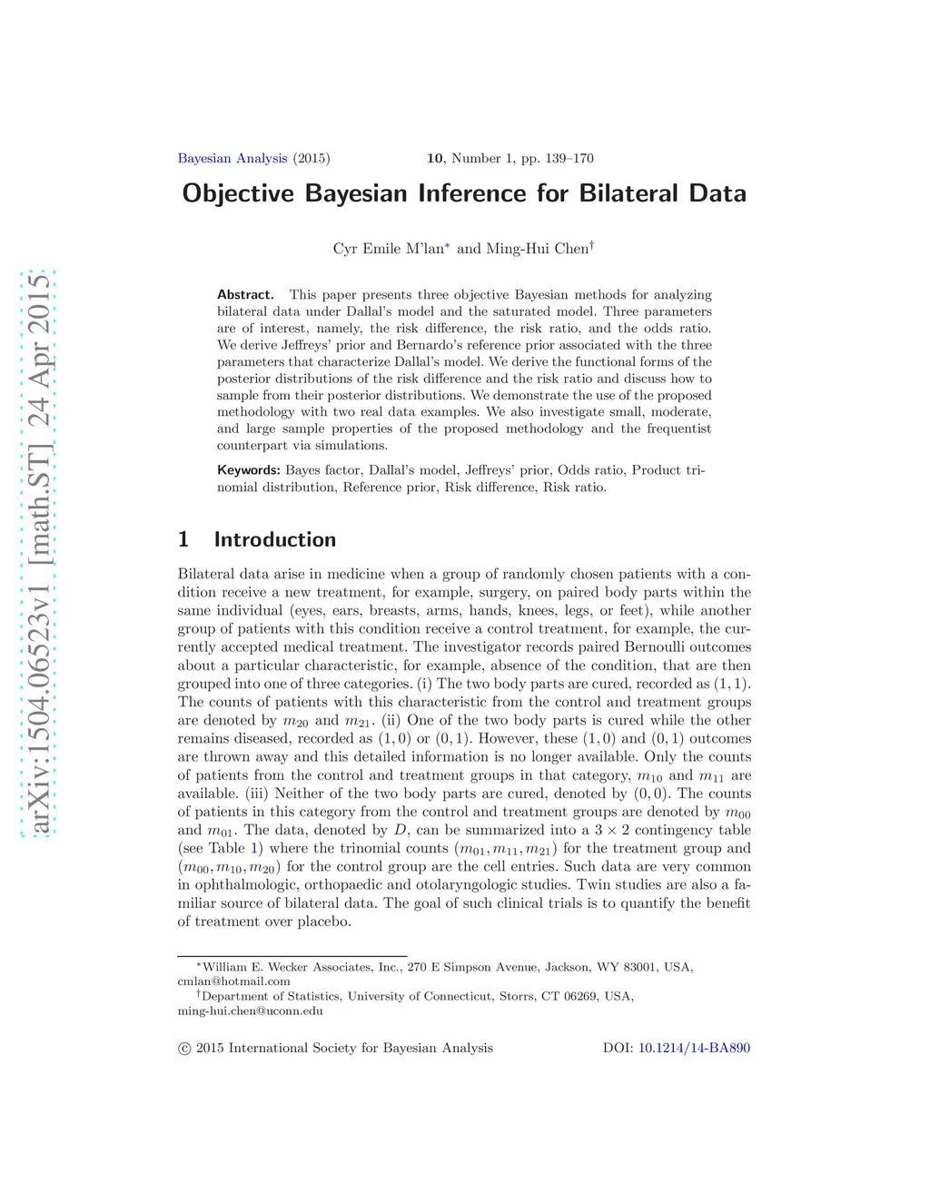 This paper presents three objective Bayesian methods for analyzing bilateral data under Dallal's model and the saturated model. Three parameters are of interest, namely, the risk difference, the risk ratio, and the odds ratio. We derive Jeffreys' prior and Bernardo's reference prior associated with the three parameters that characterize Dallal's model. We derive the functional forms of the posterior distributions of the risk difference and the risk ratio and discuss how to sample from their posterior distributions. We demonstrate the use of the proposed methodology with two real data examples. We also investigate small, moderate, and large sample properties of the proposed methodology and the frequentist counterpart via simulations.
