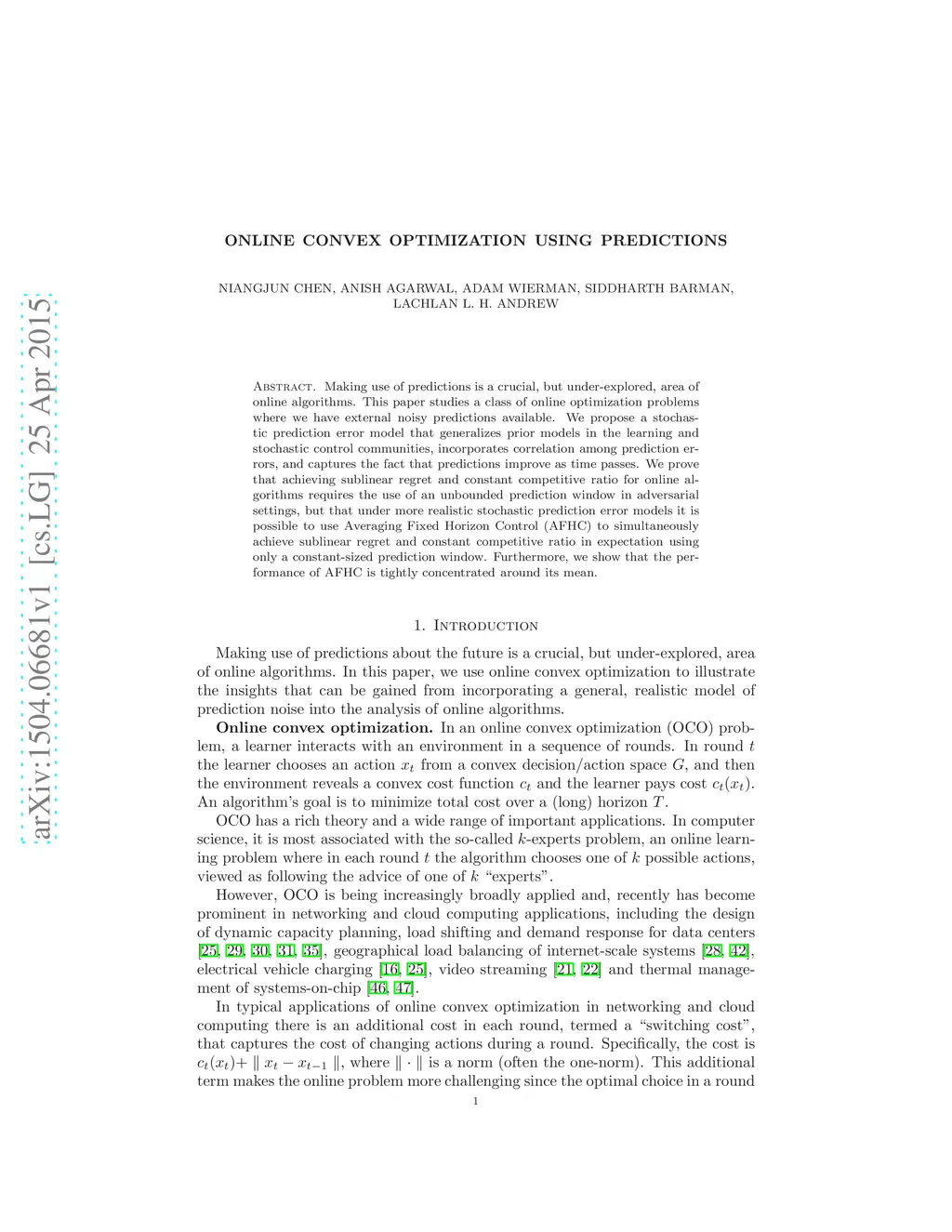 Making use of predictions is a crucial, but under-explored, area of online algorithms. This paper studies a class of online optimization problems where we have external noisy predictions available. We propose a stochastic prediction error model that generalizes prior models in the learning and stochastic control communities, incorporates correlation among prediction errors, and captures the fact that predictions improve as time passes. We prove that achieving sublinear regret and constant competitive ratio for online algorithms requires the use of an unbounded prediction window in adversarial settings, but that under more realistic stochastic prediction error models it is possible to use Averaging Fixed Horizon Control (AFHC) to simultaneously achieve sublinear regret and constant competitive ratio in expectation using only a constant-sized prediction window. Furthermore, we show that the performance of AFHC is tightly concentrated around its mean.