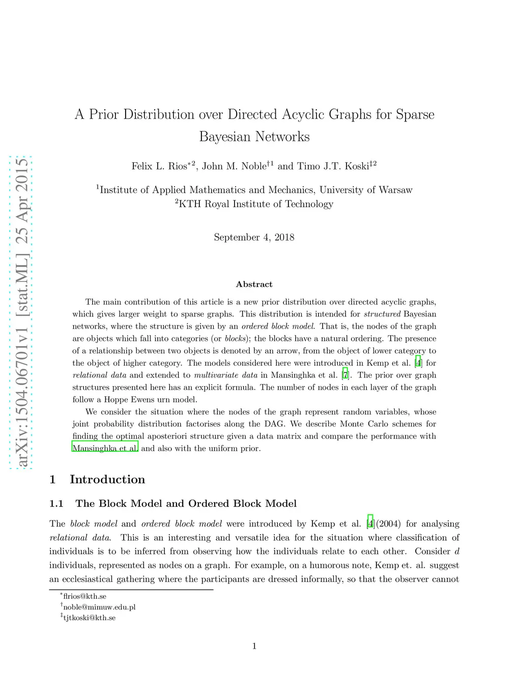 The main contribution of this article is a new prior distribution over directed acyclic graphs, which gives larger weight to sparse graphs. This distribution is intended for structured Bayesian networks, where the structure is given by an ordered block model. That is, the nodes of the graph are objects which fall into categories (or blocks); the blocks have a natural ordering. The presence of a relationship between two objects is denoted by an arrow, from the object of lower category to the object of higher category. The models considered here were introduced in Kemp et al. (2004) for relational data and extended to multivariate data in Mansinghka et al. (2006). The prior over graph structures presented here has an explicit formula. The number of nodes in each layer of the graph follow a Hoppe Ewens urn model. We consider the situation where the nodes of the graph represent random variables, whose joint probability distribution factorises along the DAG. We describe Monte Carlo schemes for finding the optimal aposteriori structure given a data matrix and compare the performance with Mansinghka et al. (2006) and also with the uniform prior.