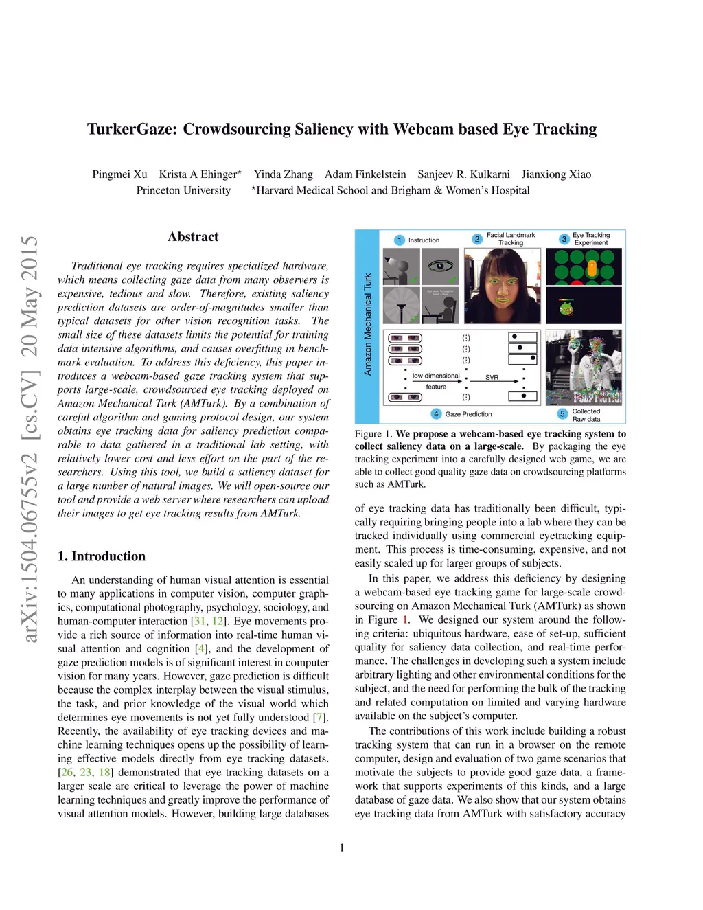 TurkerGaze: Crowdsourcing Saliency with Webcam based Eye Tracking