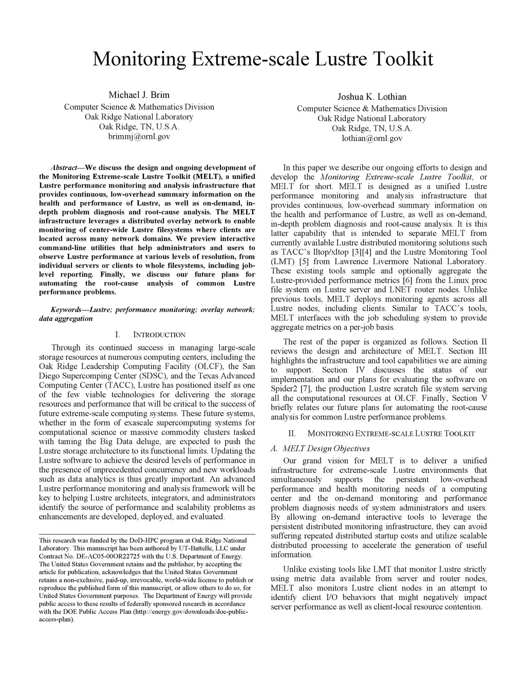 We discuss the design and ongoing development of the Monitoring Extreme-scale Lustre Toolkit (MELT), a unified Lustre performance monitoring and analysis infrastructure that provides continuous, low-overhead summary information on the health and performance of Lustre, as well as on-demand, in- depth problem diagnosis and root-cause analysis. The MELT infrastructure leverages a distributed overlay network to enable monitoring of center-wide Lustre filesystems where clients are located across many network domains. We preview interactive command-line utilities that help administrators and users to observe Lustre performance at various levels of resolution, from individual servers or clients to whole filesystems, including job-level reporting. Finally, we discuss our future plans for automating the root-cause analysis of common Lustre performance problems.