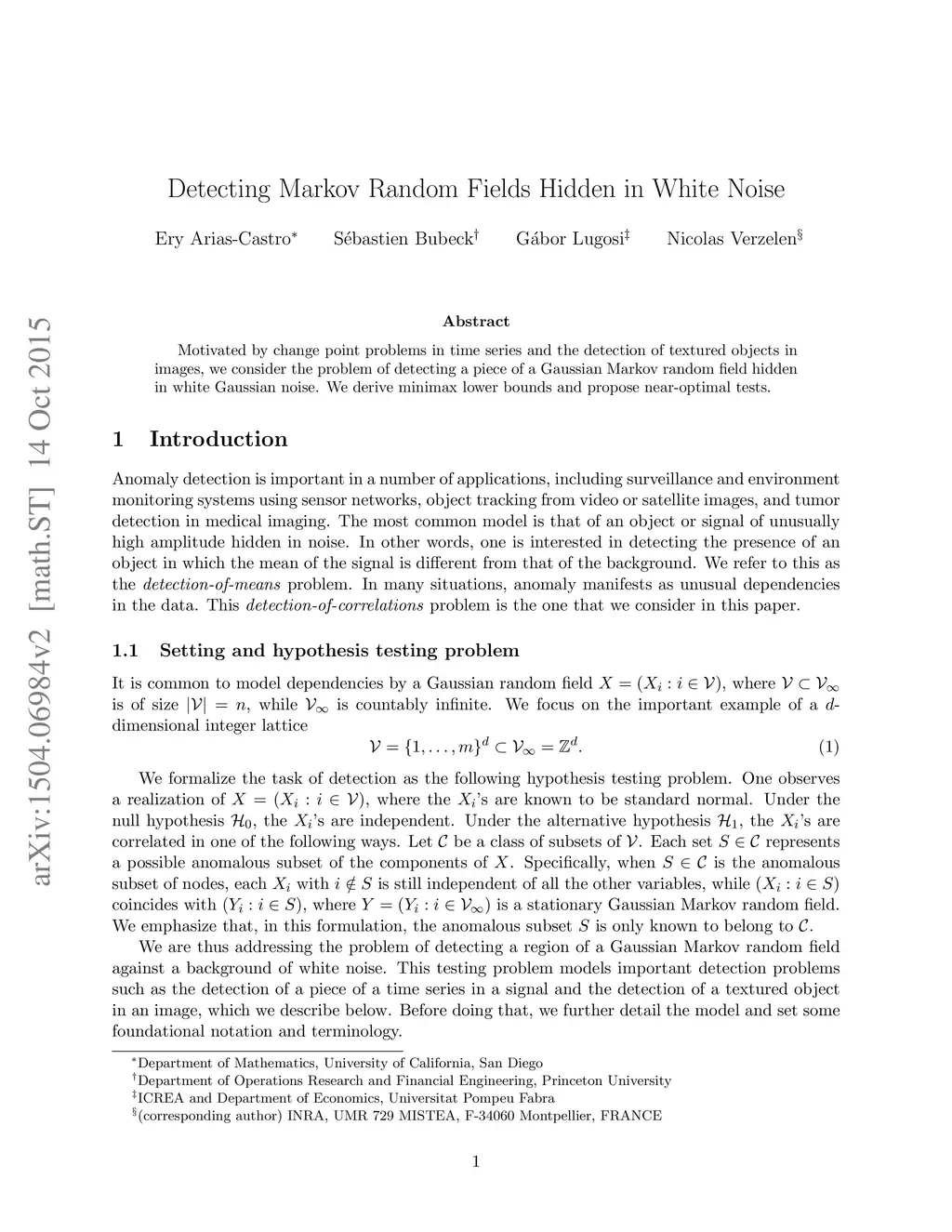 Motivated by change point problems in time series and the detection of textured objects in images, we consider the problem of detecting a piece of a Gaussian Markov random field hidden in white Gaussian noise. We derive minimax lower bounds and propose near-optimal tests.