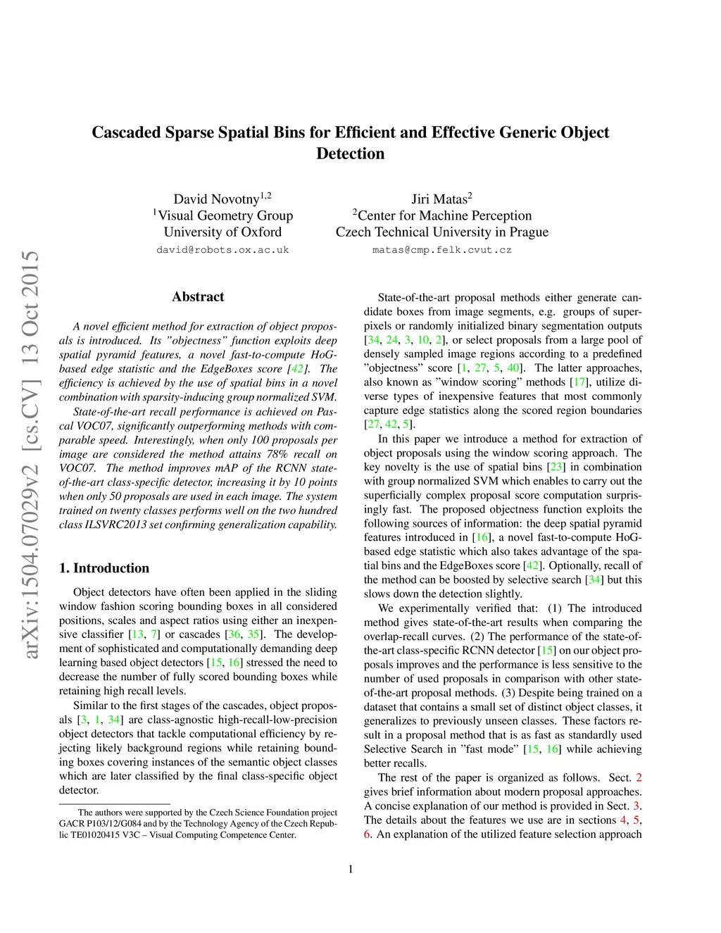 A novel efficient method for extraction of object proposals is introduced. Its "objectness" function exploits deep spatial pyramid features, a novel fast-to-compute HoG-based edge statistic and the EdgeBoxes score. The efficiency is achieved by the use of spatial bins in a novel combination with sparsity-inducing group normalized SVM. State-of-the-art recall performance is achieved on Pascal VOC07, significantly outperforming methods with comparable speed. Interestingly, when only 100 proposals per image are considered the method attains 78% recall on VOC07. The method improves mAP of the RCNN state-of-the-art class-specific detector, increasing it by 10 points when only 50 proposals are used in each image. The system trained on twenty classes performs well on the two hundred class ILSVRC2013 set confirming generalization capability.
