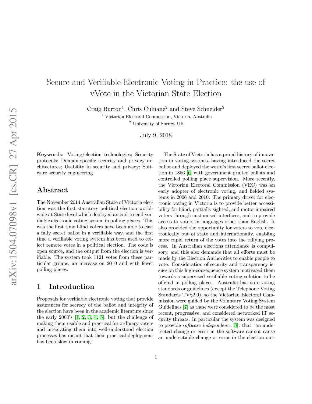 The November 2014 Australian State of Victoria election was the first statutory political election worldwide at State level which deployed an end-to-end verifiable electronic voting system in polling places. This was the first time blind voters have been able to cast a fully secret ballot in a verifiable way, and the first time a verifiable voting system has been used to collect remote votes in a political election. The code is open source, and the output from the election is verifiable. The system took 1121 votes from these particular groups, an increase on 2010 and with fewer polling places.