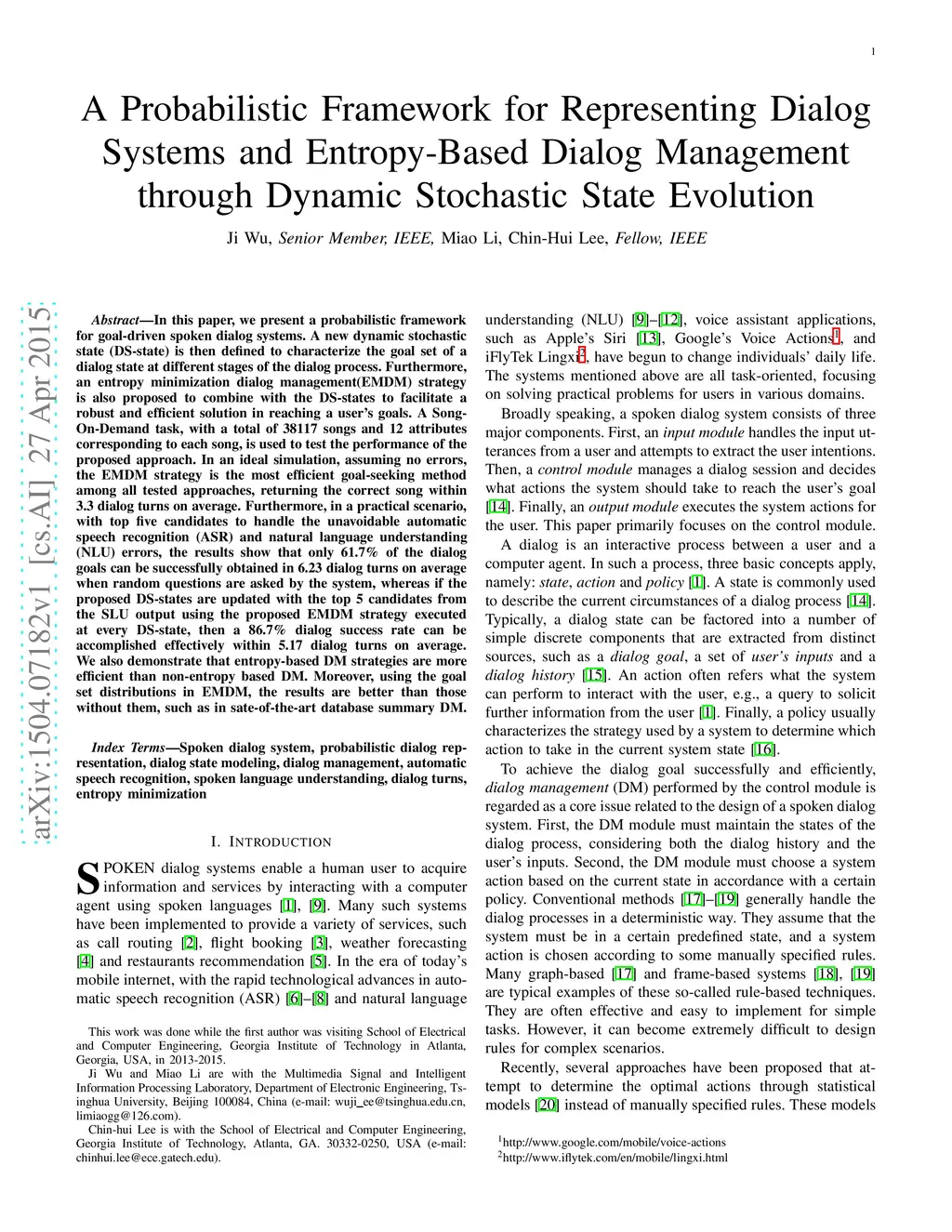 In this paper, we present a probabilistic framework for goal-driven spoken dialog systems. A new dynamic stochastic state (DS-state) is then defined to characterize the goal set of a dialog state at different stages of the dialog process. Furthermore, an entropy minimization dialog management(EMDM) strategy is also proposed to combine with the DS-states to facilitate a robust and efficient solution in reaching a user's goals. A Song-On-Demand task, with a total of 38117 songs and 12 attributes corresponding to each song, is used to test the performance of the proposed approach. In an ideal simulation, assuming no errors, the EMDM strategy is the most efficient goal-seeking method among all tested approaches, returning the correct song within 3.3 dialog turns on average. Furthermore, in a practical scenario, with top five candidates to handle the unavoidable automatic speech recognition (ASR) and natural language understanding (NLU) errors, the results show that only 61.7\% of the dialog goals can be successfully obtained in 6.23 dialog turns on average when random questions are asked by the system, whereas if the proposed DS-states are updated with the top 5 candidates from the SLU output using the proposed EMDM strategy executed at every DS-state, then a 86.7\% dialog success rate can be accomplished effectively within 5.17 dialog turns on average. We also demonstrate that entropy-based DM strategies are more efficient than non-entropy based DM. Moreover, using the goal set distributions in EMDM, the results are better than those without them, such as in sate-of-the-art database summary DM.