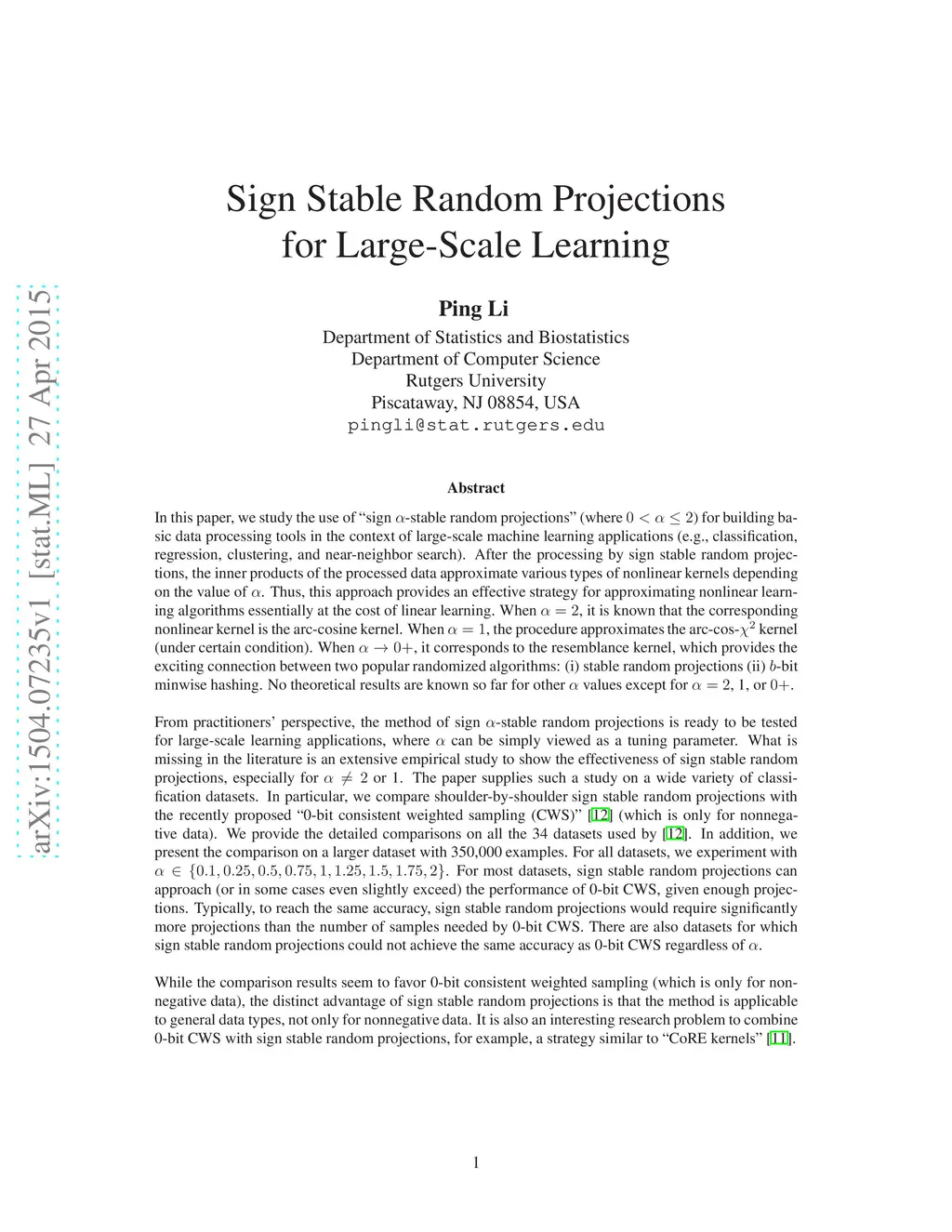 Sign Stable Random Projections for Large-Scale Learning