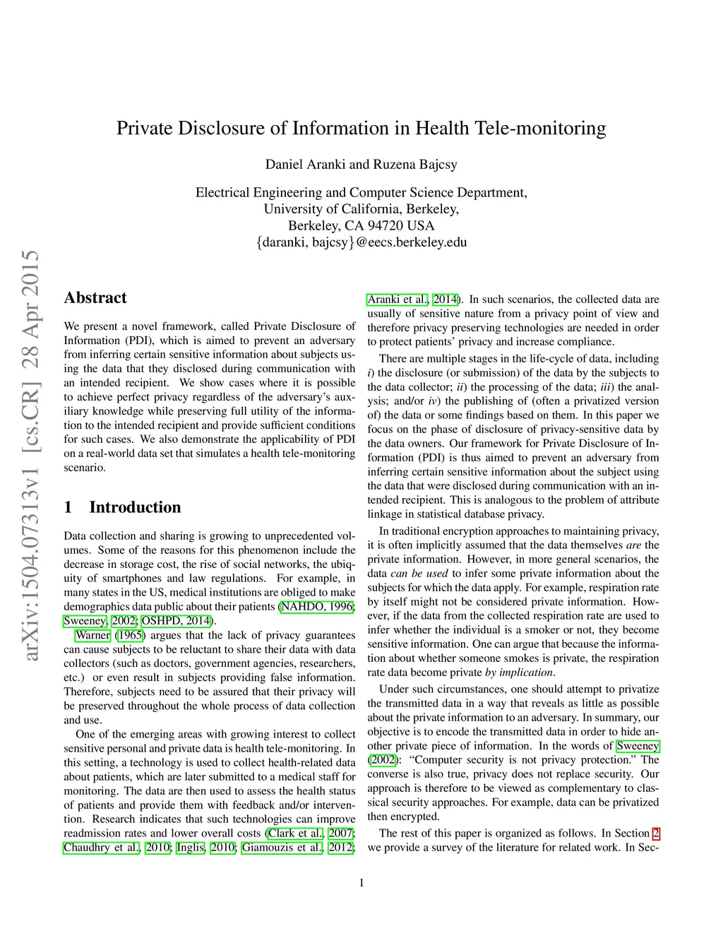Private Disclosure of Information in Health Tele-monitoring