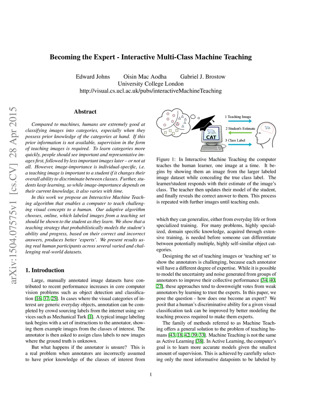 Compared to machines, humans are extremely good at classifying images into categories, especially when they possess prior knowledge of the categories at hand. If this prior information is not available, supervision in the form of teaching images is required. To learn categories more quickly, people should see important and representative images first, followed by less important images later - or not at all. However, image-importance is individual-specific, i.e. a teaching image is important to a student if it changes their overall ability to discriminate between classes. Further, students keep learning, so while image-importance depends on their current knowledge, it also varies with time. In this work we propose an Interactive Machine Teaching algorithm that enables a computer to teach challenging visual concepts to a human. Our adaptive algorithm chooses, online, which labeled images from a teaching set should be shown to the student as they learn. We show that a teaching strategy that probabilistically models the student's ability and progress, based on their correct and incorrect answers, produces better éxperts'. We present results using real human participants across several varied and challenging real-world datasets.
