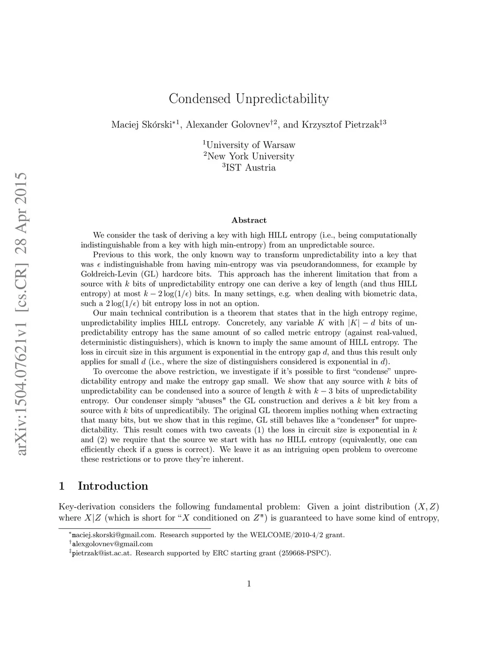 We consider the task of deriving a key with high HILL entropy from an unpredictable source. Previous to this work, the only known way to transform unpredictability into a key that was indistinguishable from having min-entropy was via pseudorandomness, for example by Goldreich-Levin (GL) hardcore bits. This approach has the inherent limitation that from a source with bits of unpredictability entropy one can derive a key of length (and thus HILL entropy) at most bits. In many settings, e.g. when dealing with biometric data, such a bit entropy loss in not an option. Our main technical contribution is a theorem that states that in the high entropy regime, unpredictability implies HILL entropy. The loss in circuit size in this argument is exponential in the entropy gap . To overcome the above restriction, we investigate if it's possible to first "condense" unpredictability entropy and make the entropy gap small. We show that any source with bits of unpredictability can be condensed into a source of length with bits of unpredictability entropy. Our condenser simply "abuses" the GL construction and derives a bit key from a source with bits of unpredicatibily. The original GL theorem implies nothing when extracting that many bits, but we show that in this regime, GL still behaves like a "condenser" for unpredictability. This result comes with two caveats (1) the loss in circuit size is exponential in and (2) we require that the source we start with has \emph{no} HILL entropy (equivalently, one can efficiently check if a guess is correct). We leave it as an intriguing open problem to overcome these restrictions or to prove they're inherent.