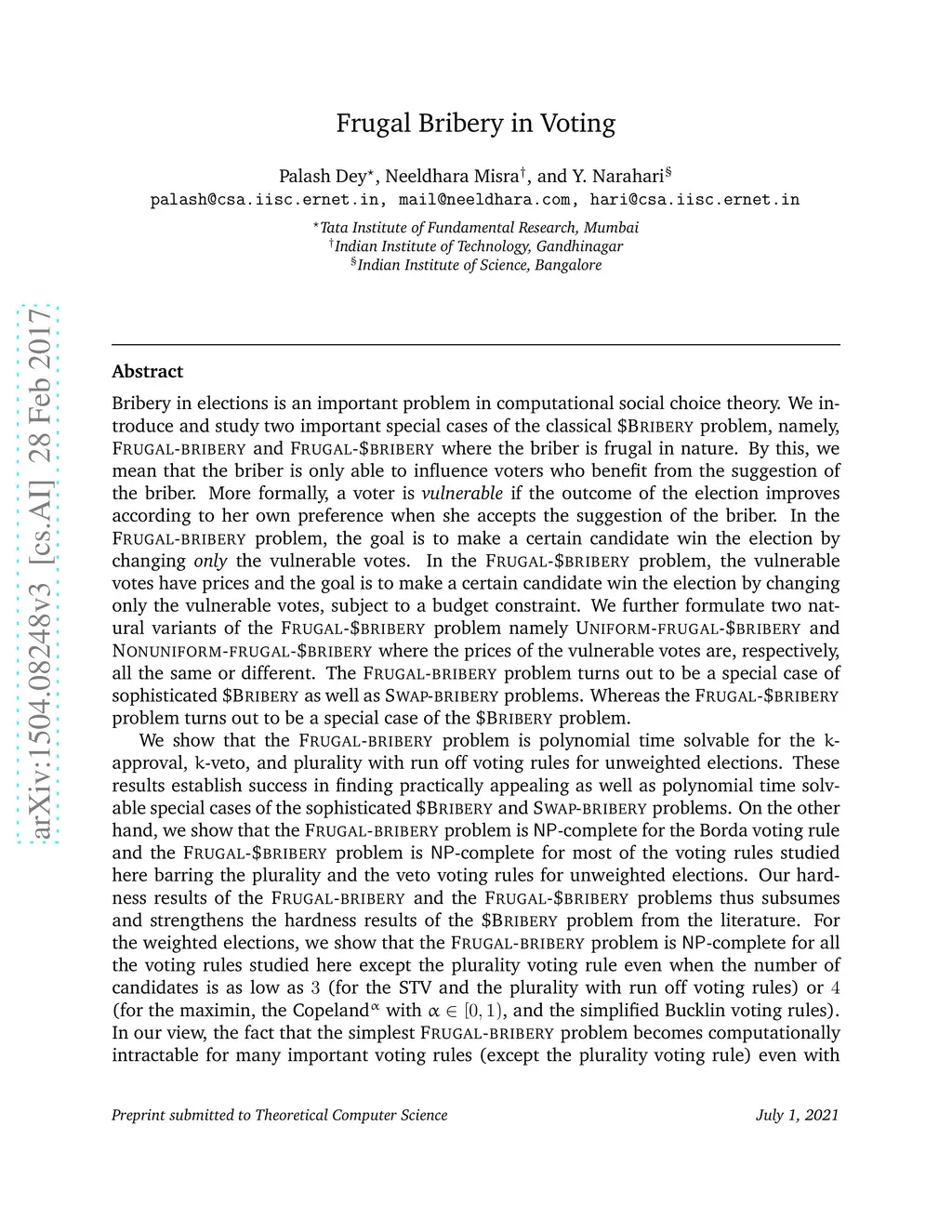 Bribery in elections is an important problem in computational social choice theory. However, bribery with money is often illegal in elections. Motivated by this, we introduce the notion of frugal bribery and formulate two new pertinent computational problems which we call Frugal-bribery and Frugal- $bribery to capture bribery without money in elections. In the proposed model, the briber is frugal in nature and this is captured by her inability to bribe votes of a certain kind, namely, non-vulnerable votes. In the Frugal-bribery problem, the goal is to make a certain candidate win the election by changing only vulnerable votes. In the Frugal-{dollar}bribery problem, the vulnerable votes have prices and the goal is to make a certain candidate win the election by changing only vulnerable votes, subject to a budget constraint of the briber. We further formulate two natural variants of the Frugal-{dollar}bribery problem namely Uniform-frugal-{dollar}bribery and Nonuniform-frugal-{dollar}bribery where the prices of the vulnerable votes are, respectively, all the same or different. We study the computational complexity of the above problems for unweighted and weighted elections for several commonly used voting rules. We observe that, even if we have only a small number of candidates, the problems are intractable for all voting rules studied here for weighted elections, with the sole exception of the Frugal-bribery problem for the plurality voting rule. In contrast, we have polynomial time algorithms for the Frugal-bribery problem for plurality, veto, k-approval, k-veto, and plurality with runoff voting rules for unweighted elections. However, the Frugal-{dollar}bribery problem is intractable for all the voting rules studied here barring the plurality and the veto voting rules for unweighted elections.