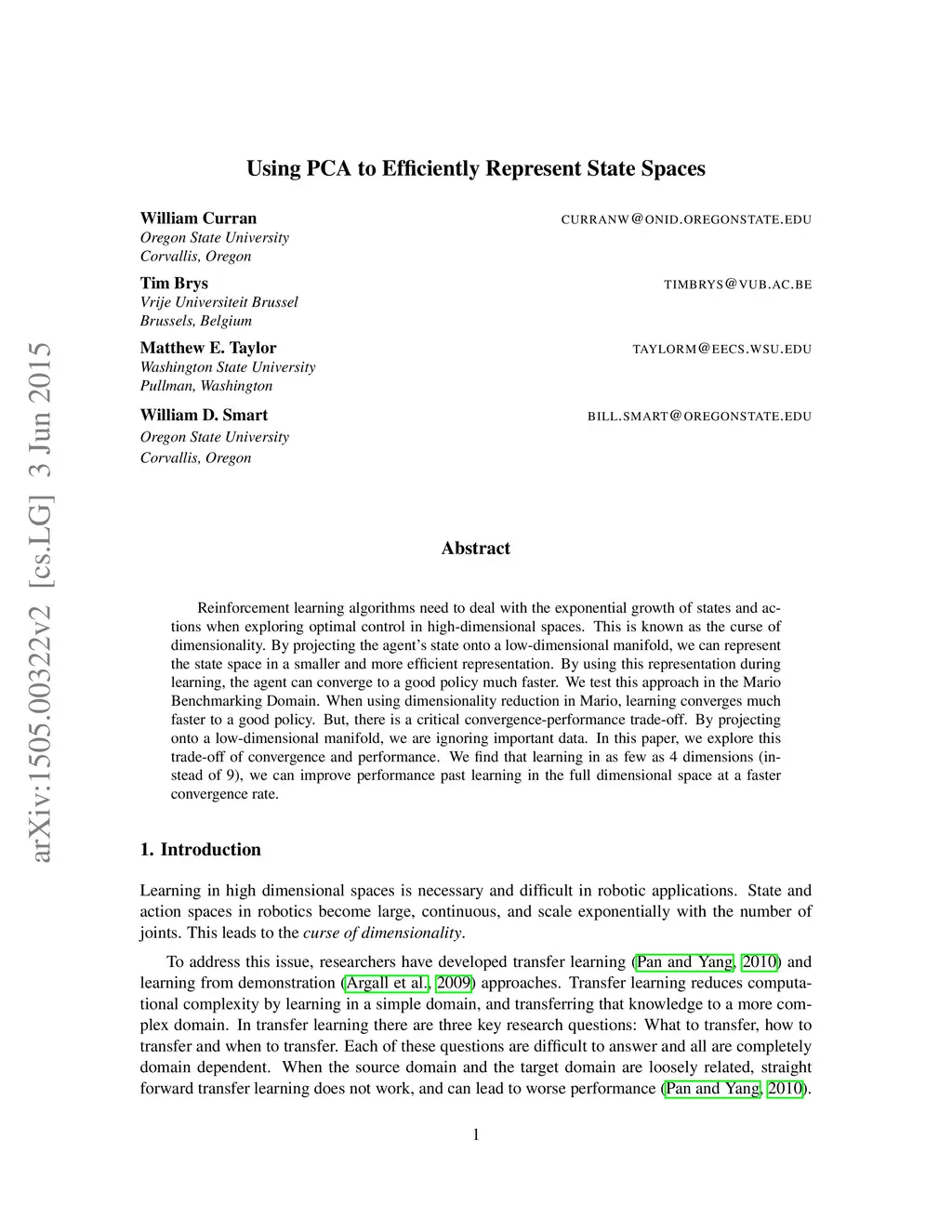 Reinforcement learning algorithms need to deal with the exponential growth of states and actions when exploring optimal control in high-dimensional spaces. This is known as the curse of dimensionality. By projecting the agent's state onto a low-dimensional manifold, we can represent the state space in a smaller and more efficient representation. By using this representation during learning, the agent can converge to a good policy much faster. We test this approach in the Mario Benchmarking Domain. When using dimensionality reduction in Mario, learning converges much faster to a good policy. But, there is a critical convergence-performance trade-off. By projecting onto a low-dimensional manifold, we are ignoring important data. In this paper, we explore this trade-off of convergence and performance. We find that learning in as few as 4 dimensions (instead of 9), we can improve performance past learning in the full dimensional space at a faster convergence rate.