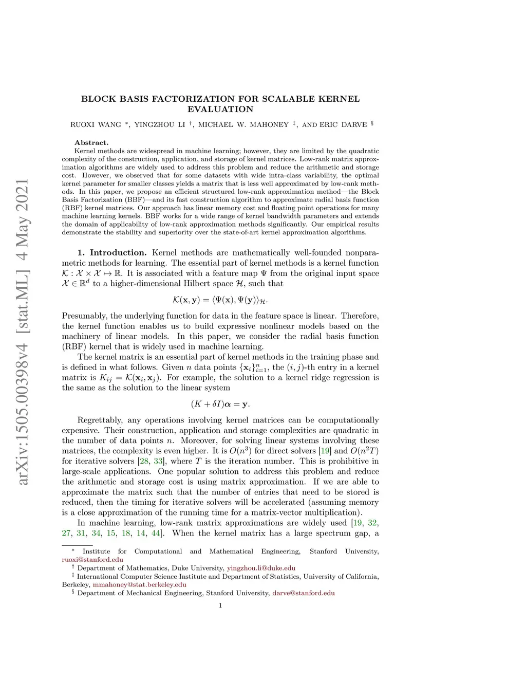 Kernel methods are widespread in machine learning; however, they are limited by the quadratic complexity of the construction, application, and storage of kernel matrices. Low-rank matrix approximation algorithms are widely used to address this problem and reduce the arithmetic and storage cost. However, we observed that for some datasets with wide intra-class variability, the optimal kernel parameter for smaller classes yields a matrix that is less well approximated by low-rank methods. In this paper, we propose an efficient structured low-rank approximation method -- the Block Basis Factorization (BBF) -- and its fast construction algorithm to approximate radial basis function (RBF) kernel matrices. Our approach has linear memory cost and floating-point operations for many machine learning kernels. BBF works for a wide range of kernel bandwidth parameters and extends the domain of applicability of low-rank approximation methods significantly. Our empirical results demonstrate the stability and superiority over the state-of-art kernel approximation algorithms.