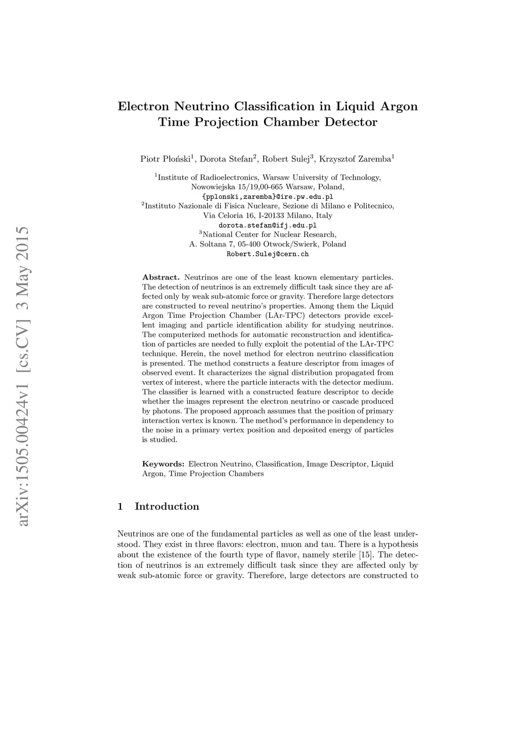 Neutrinos are one of the least known elementary particles. The detection of neutrinos is an extremely difficult task since they are affected only by weak sub-atomic force or gravity. Therefore large detectors are constructed to reveal neutrino's properties. Among them the Liquid Argon Time Projection Chamber (LAr-TPC) detectors provide excellent imaging and particle identification ability for studying neutrinos. The computerized methods for automatic reconstruction and identification of particles are needed to fully exploit the potential of the LAr-TPC technique. Herein, the novel method for electron neutrino classification is presented. The method constructs a feature descriptor from images of observed event. It characterizes the signal distribution propagated from vertex of interest, where the particle interacts with the detector medium. The classifier is learned with a constructed feature descriptor to decide whether the images represent the electron neutrino or cascade produced by photons. The proposed approach assumes that the position of primary interaction vertex is known. The method's performance in dependency to the noise in a primary vertex position and deposited energy of particles is studied.