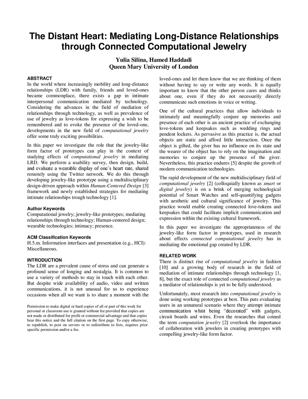 In the world where increasingly mobility and long-distance relationships with family, friends and loved-ones became commonplace, there exists a gap in intimate interpersonal communication mediated by technology. Considering the advances in the field of mediation of relationships through technology, as well as prevalence of use of jewelry as love-tokens for expressing a wish to be remembered and to evoke the presence of the loved-one, developments in the new field of computational jewelry offer some truly exciting possibilities. In this paper we investigate the role that the jewelry-like form factor of prototypes can play in the context of studying effects of computational jewelry in mediating long-distance relationships.