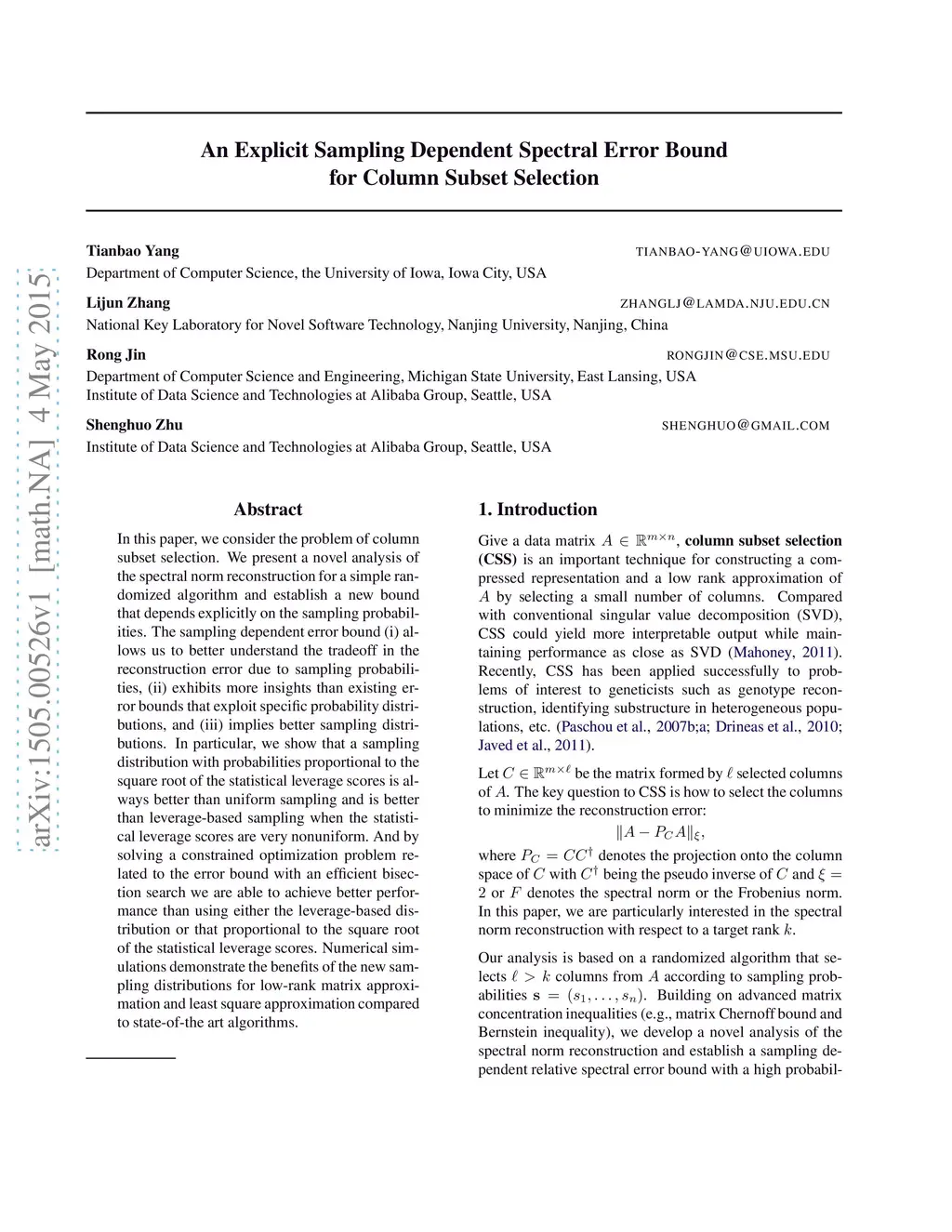 In this paper, we consider the problem of column subset selection. We present a novel analysis of the spectral norm reconstruction for a simple randomized algorithm and establish a new bound that depends explicitly on the sampling probabilities. The sampling dependent error bound (i) allows us to better understand the tradeoff in the reconstruction error due to sampling probabilities, (ii) exhibits more insights than existing error bounds that exploit specific probability distributions, and (iii) implies better sampling distributions. In particular, we show that a sampling distribution with probabilities proportional to the square root of the statistical leverage scores is always better than uniform sampling and is better than leverage-based sampling when the statistical leverage scores are very nonuniform. And by solving a constrained optimization problem related to the error bound with an efficient bisection search we are able to achieve better performance than using either the leverage-based distribution or that proportional to the square root of the statistical leverage scores. Numerical simulations demonstrate the benefits of the new sampling distributions for low-rank matrix approximation and least square approximation compared to state-of-the art algorithms.