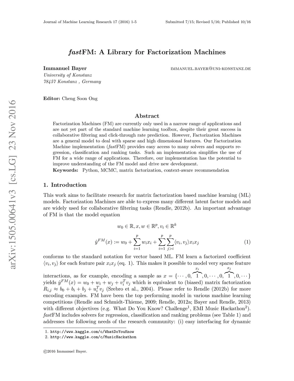 Factorization Machines (FM) are only used in a narrow range of applications and are not part of the standard toolbox of machine learning models. This is a pity, because even though FMs are recognized as being very successful for recommender system type applications they are a general model to deal with sparse and high dimensional features. Our Factorization Machine implementation provides easy access to many solvers and supports regression, classification and ranking tasks. Such an implementation simplifies the use of FM's for a wide field of applications. This implementation has the potential to improve our understanding of the FM model and drive new development.