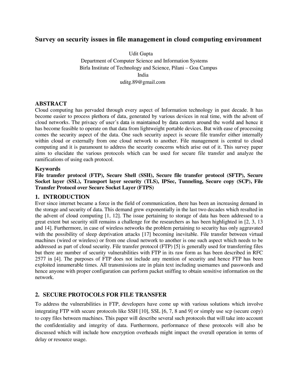 Cloud computing has pervaded through every aspect of Information technology in past decade. It has become easier to process plethora of data, generated by various devices in real time, with the advent of cloud networks. The privacy of users data is maintained by data centers around the world and hence it has become feasible to operate on that data from lightweight portable devices. But with ease of processing comes the security aspect of the data. One such security aspect is secure file transfer either internally within cloud or externally from one cloud network to another. File management is central to cloud computing and it is paramount to address the security concerns which arise out of it. This survey paper aims to elucidate the various protocols which can be used for secure file transfer and analyze the ramifications of using each protocol.