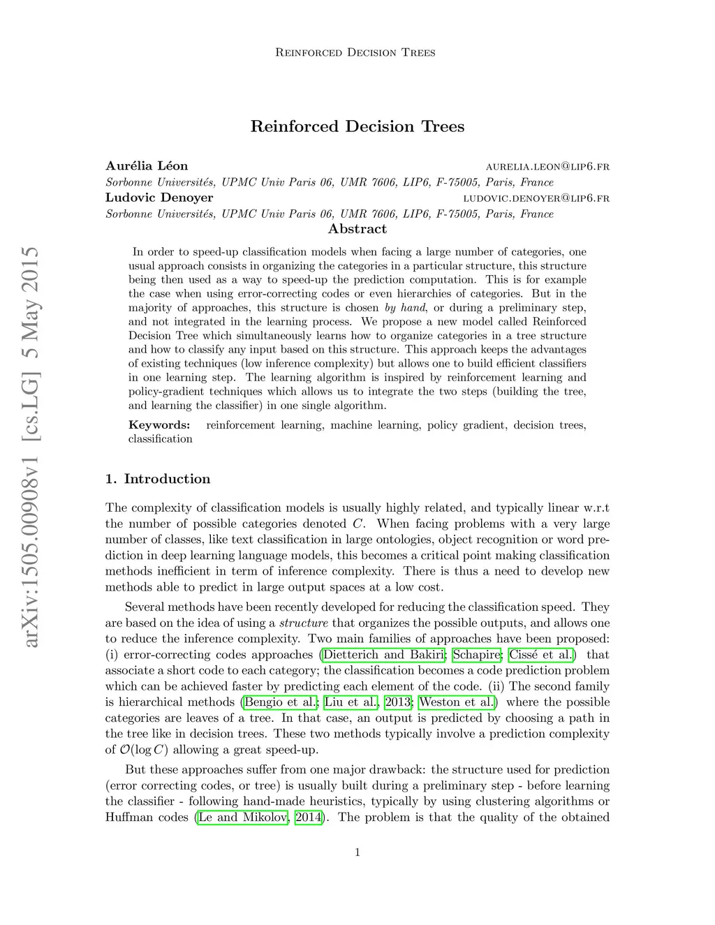 In order to speed-up classification models when facing a large number of categories, one usual approach consists in organizing the categories in a particular structure, this structure being then used as a way to speed-up the prediction computation. This is for example the case when using error-correcting codes or even hierarchies of categories. But in the majority of approaches, this structure is chosen \textit{by hand}, or during a preliminary step, and not integrated in the learning process. We propose a new model called Reinforced Decision Tree which simultaneously learns how to organize categories in a tree structure and how to classify any input based on this structure. This approach keeps the advantages of existing techniques (low inference complexity) but allows one to build efficient classifiers in one learning step. The learning algorithm is inspired by reinforcement learning and policy-gradient techniques which allows us to integrate the two steps (building the tree, and learning the classifier) in one single algorithm.