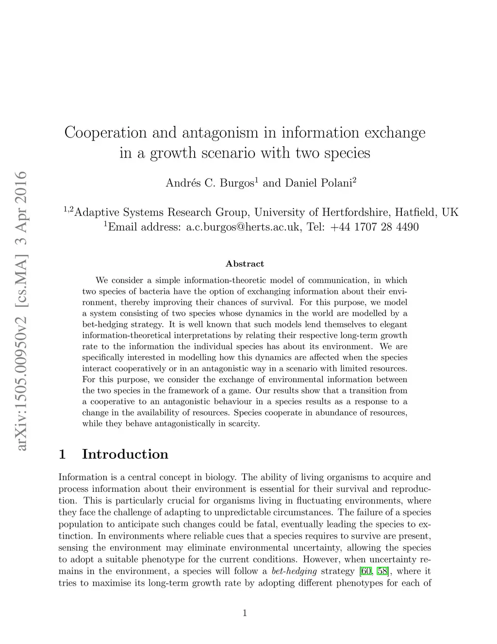 We consider a simple information-theoretic model of communication, in which two species of bacteria have the option of exchanging information about their environment, thereby improving their chances of survival. For this purpose, we model a system consisting of two species whose dynamics in the world are modelled by a bet-hedging strategy. It is well known that such models lend themselves to elegant information-theoretical interpretations by relating their respective long-term growth rate to the information the individual species has about its environment. We are specifically interested in modelling how this dynamics are affected when the species interact cooperatively or in an antagonistic way in a scenario with limited resources. For this purpose, we consider the exchange of environmental information between the two species in the framework of a game. Our results show that a transition from a cooperative to an antagonistic behaviour in a species results as a response to a change in the availability of resources. Species cooperate in abundance of resources, while they behave antagonistically in scarcity.
