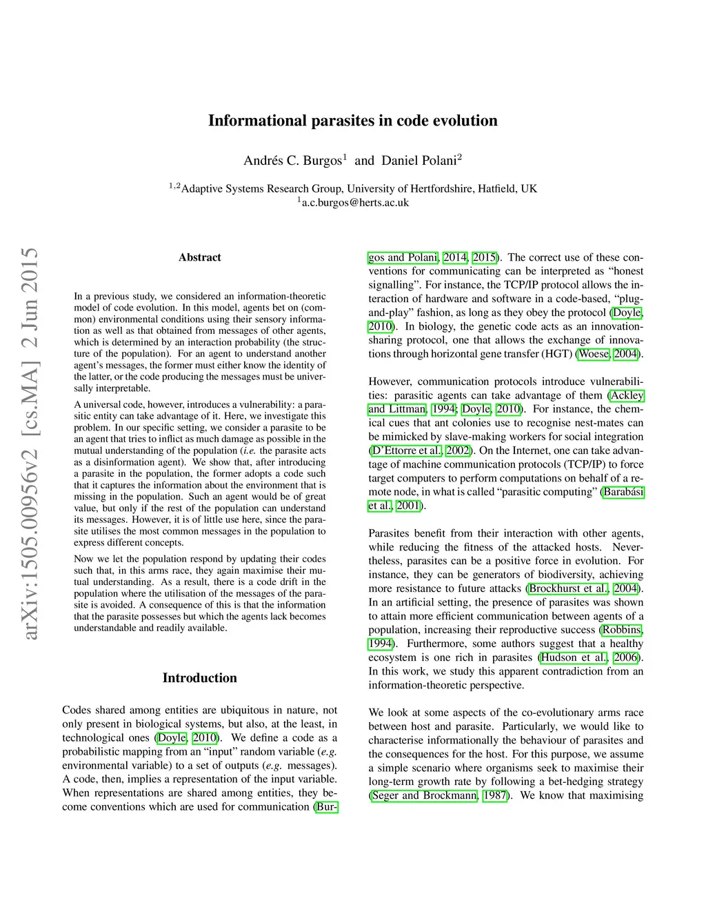 In a previous study, we considered an information-theoretic model of code evolution. In it, agents obtain information about their (common) environment by the perception of messages of other agents, which is determined by an interaction probability (the structure of the population). For an agent to understand another agent's messages, the former must either know the identity of the latter, or the code producing the messages must be universally interpretable. A universal code, however, introduces a vulnerability: a parasitic entity can take advantage of it. Here, we investigate this problem. In our specific setting, we consider a parasite to be an agent that tries to inflict as much damage as possible in the mutual understanding of the population (i.e. the parasite acts as a disinformation agent). We show that, after introducing a parasite in the population, the former adopts a code such that it captures the information about the environment that is missing in the population. Such agent would be of great value, but only if the rest of the population could understand its messages. However, it is of little use here, since the parasite utilises the most common messages in the population to express different concepts. Now we let the population respond by updating their codes such that, in this arms race, they again maximise their mutual understanding. As a result, there is a code drift in the population where the utilisation of the messages of the parasite is avoided. A consequence of this is that the information that the parasite possesses but the agents lack becomes understandable and readily available.