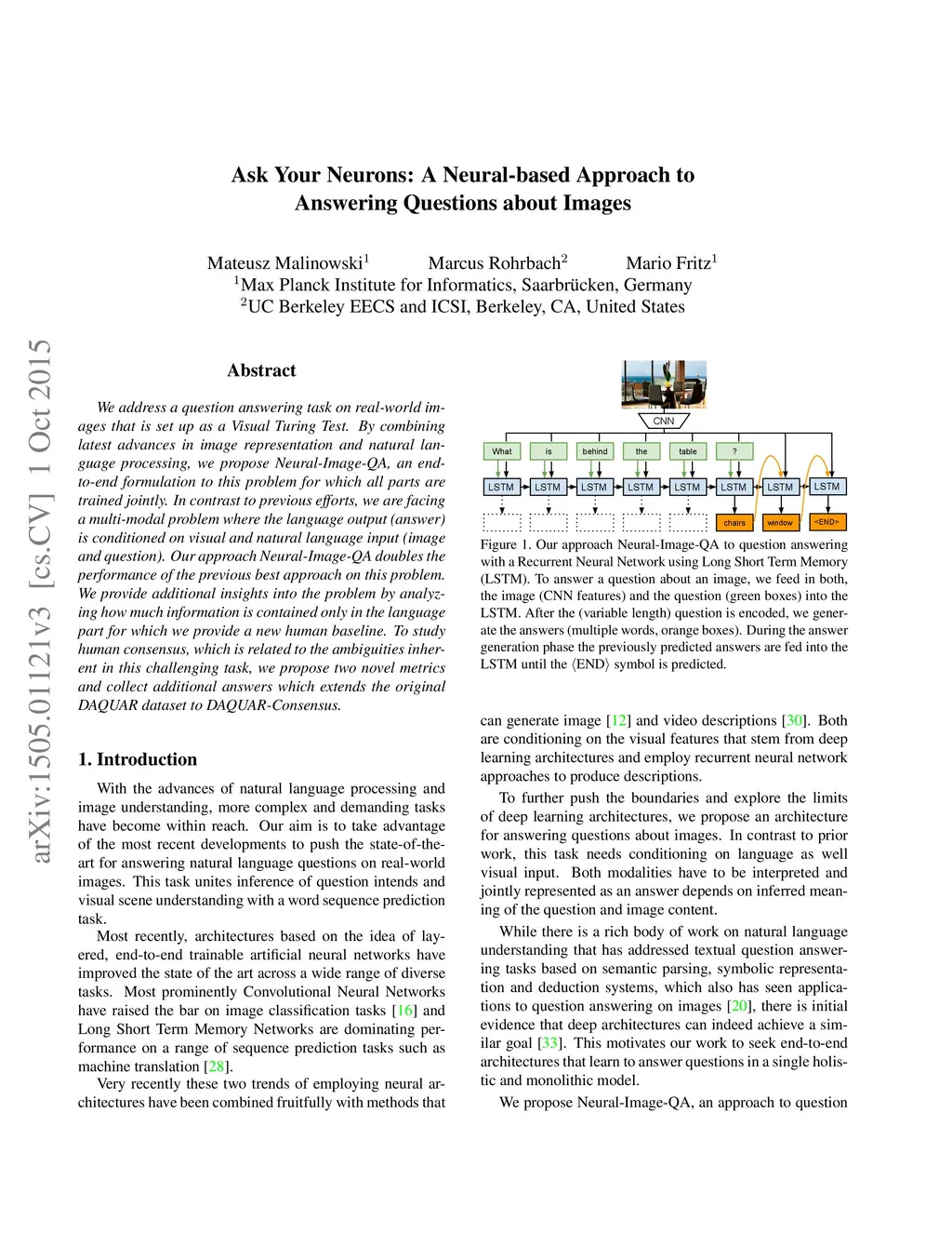 We address a question answering task on real-world images that is set up as a Visual Turing Test. By combining latest advances in image representation and natural language processing, we propose Neural-Image-QA, an end-to-end formulation to this problem for which all parts are trained jointly. In contrast to previous efforts, we are facing a multi-modal problem where the language output (answer) is conditioned on visual and natural language input (image and question). Our approach Neural-Image-QA doubles the performance of the previous best approach on this problem. We provide additional insights into the problem by analyzing how much information is contained only in the language part for which we provide a new human baseline. To study human consensus, which is related to the ambiguities inherent in this challenging task, we propose two novel metrics and collect additional answers which extends the original DAQUAR dataset to DAQUAR-Consensus.
